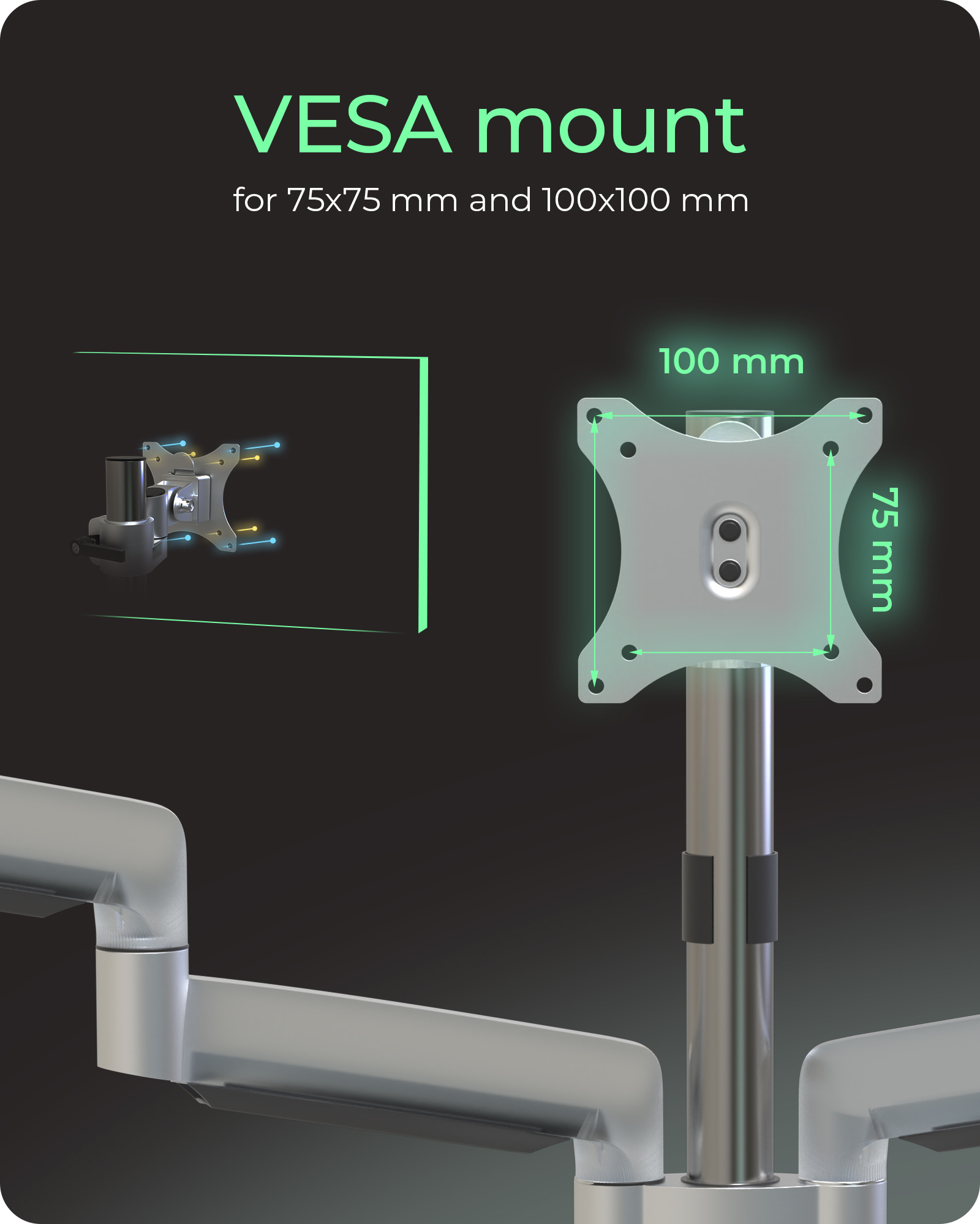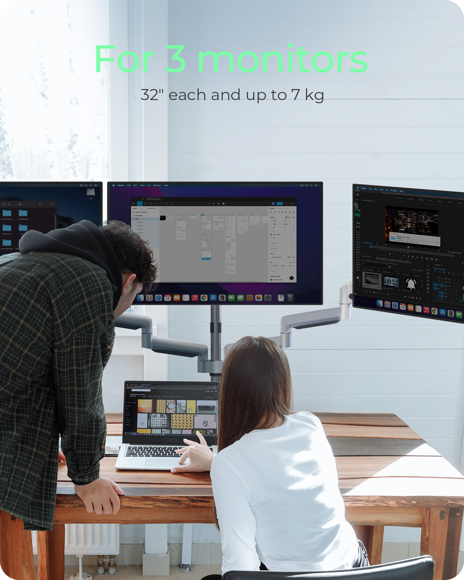 The triple monitor stand provides valuable work space on your desk. Constructed of high-grade aluminium, this stand is built to support three monitors up to 32 inch in size each. The IB-MS505-TI offers a variety of features including an easy height adjustment, tilting angles for your screens and numerous adjustable joints. Tighten or loosen each joint according to your preferences. Monitors can be rotated to landscape and portrait positions.