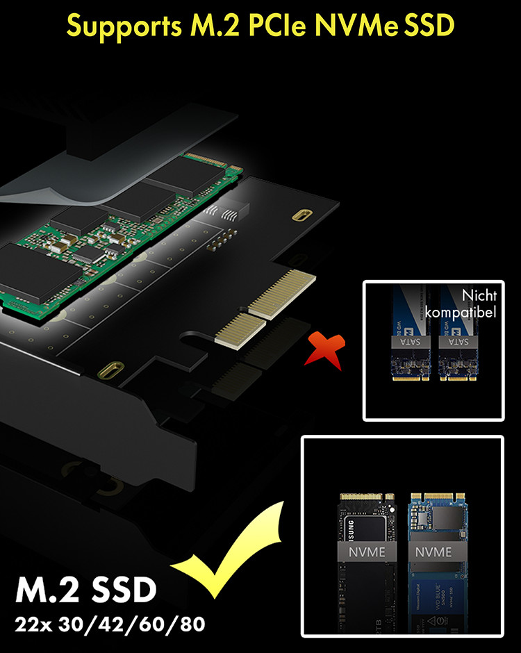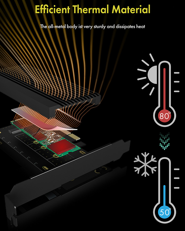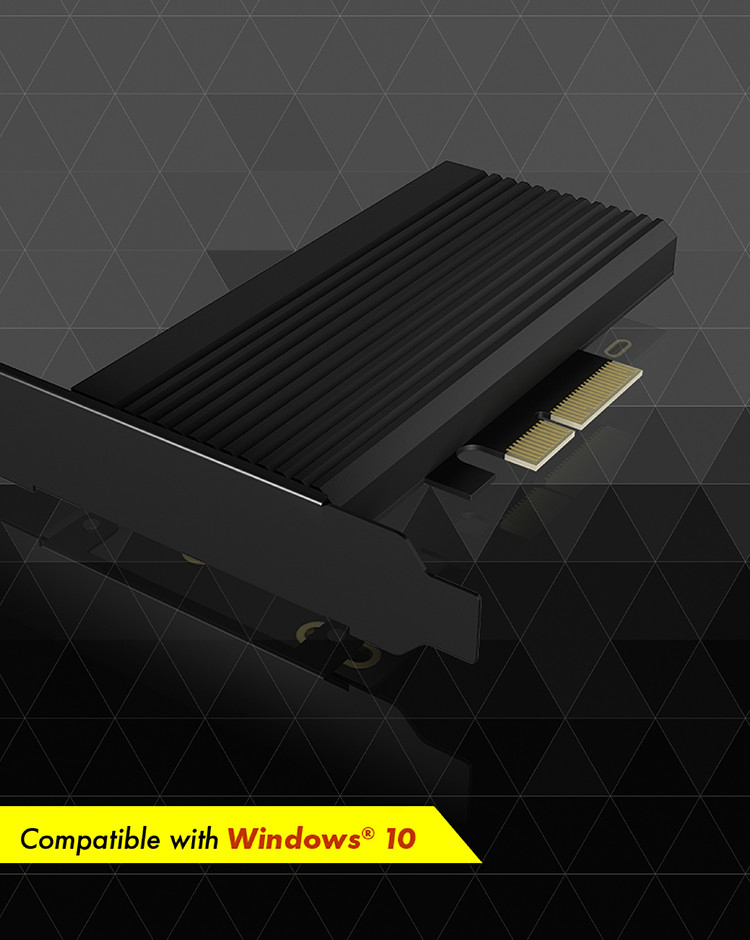 Even with the highest demands, your SSD always stays cool. The large, solid aluminium heat sink in the innovative cooling fin design ensures sufficient heat dissipation to keep your SSD running stably and efficiently. In addition, the expansion card comes with thermal pads that are applied to the M.2 SSD.