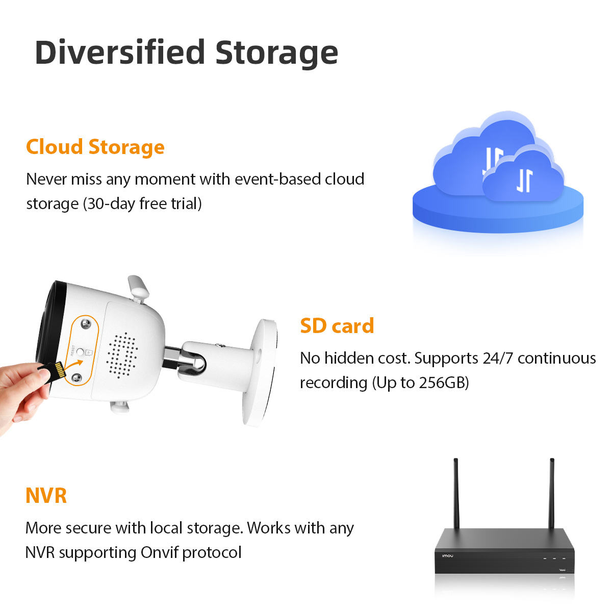 Video recordings are securely stored and accessible via the SD card, NVR or cloud storage.