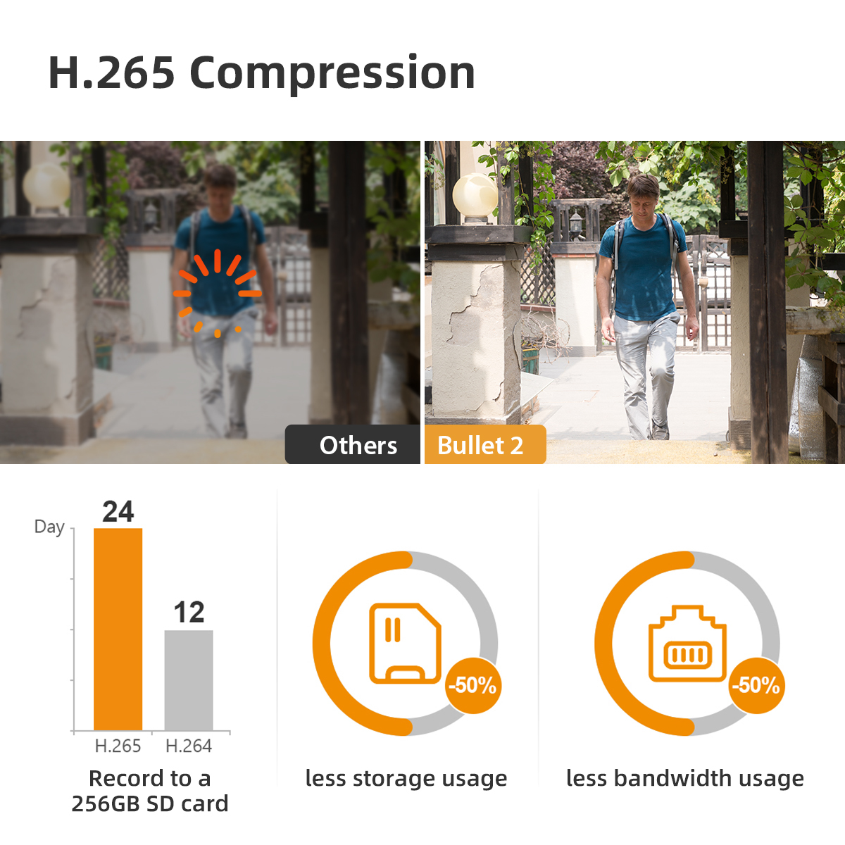 The 1080P sensor and advanced IR algorithms provide crystal clear video both day and night. The cutting-edge H.265 compression reduces network bandwidth and storage usage by 50% at the same video quality.