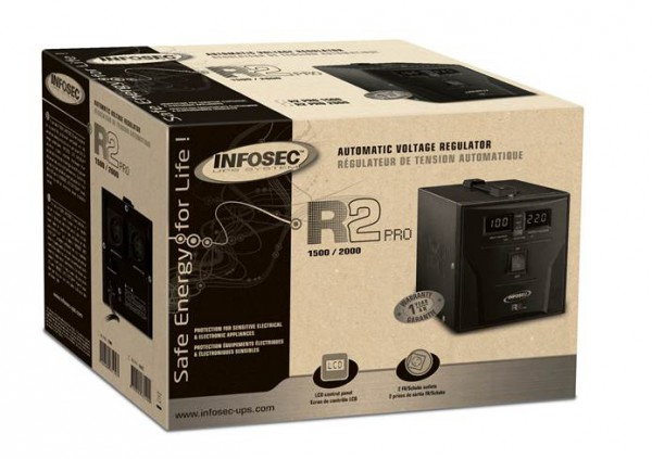 Infosec R2 Pro 1500. Nominal input voltage: 72 - 290 V, Input frequency: 50/60 Hz. Output voltage: 180-260 V, Output frequency: 50/60 Hz, Output power capacity: 1.5 kVA. AC outlets quantity: 2 AC outlet(s). Voltage correction range: 80 - 260 V. Display: LED
