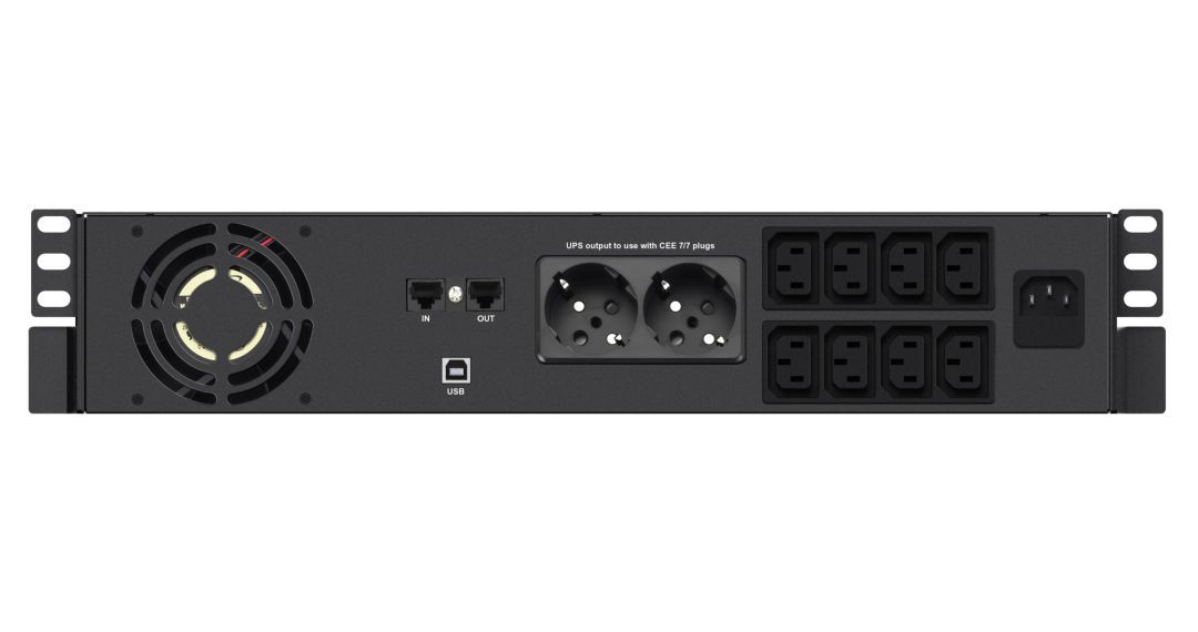 Each model is equipped with both IEC outlets and FR / SCHUKO type outlets. Its USB communication port allows remote control of the UPS through the Infopower software (see description on the back), which also manages the automatic closing of files by the UPS in the event of a power failure. X4 RM Plus also protects the ADSL line thanks to RJ45 connectors.