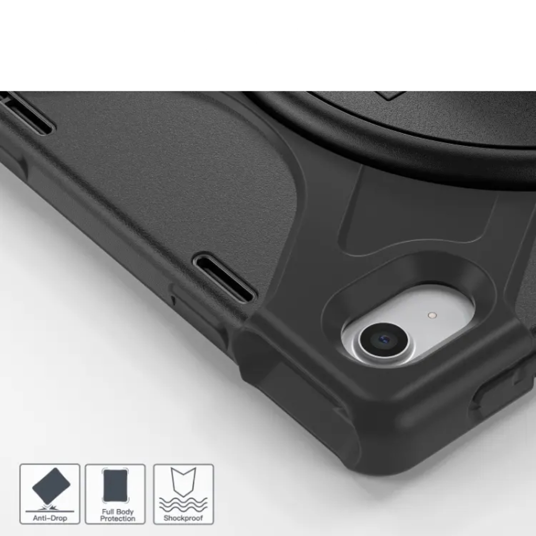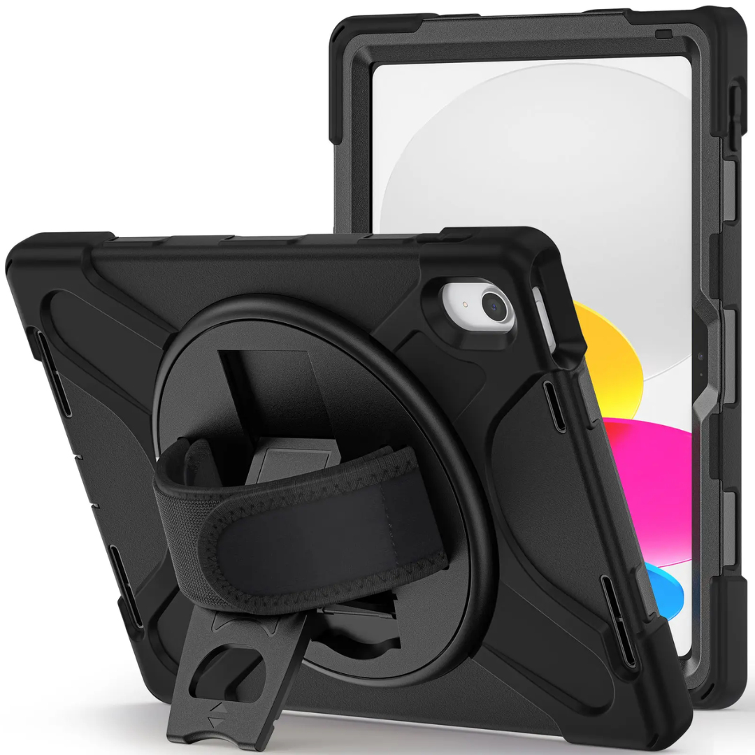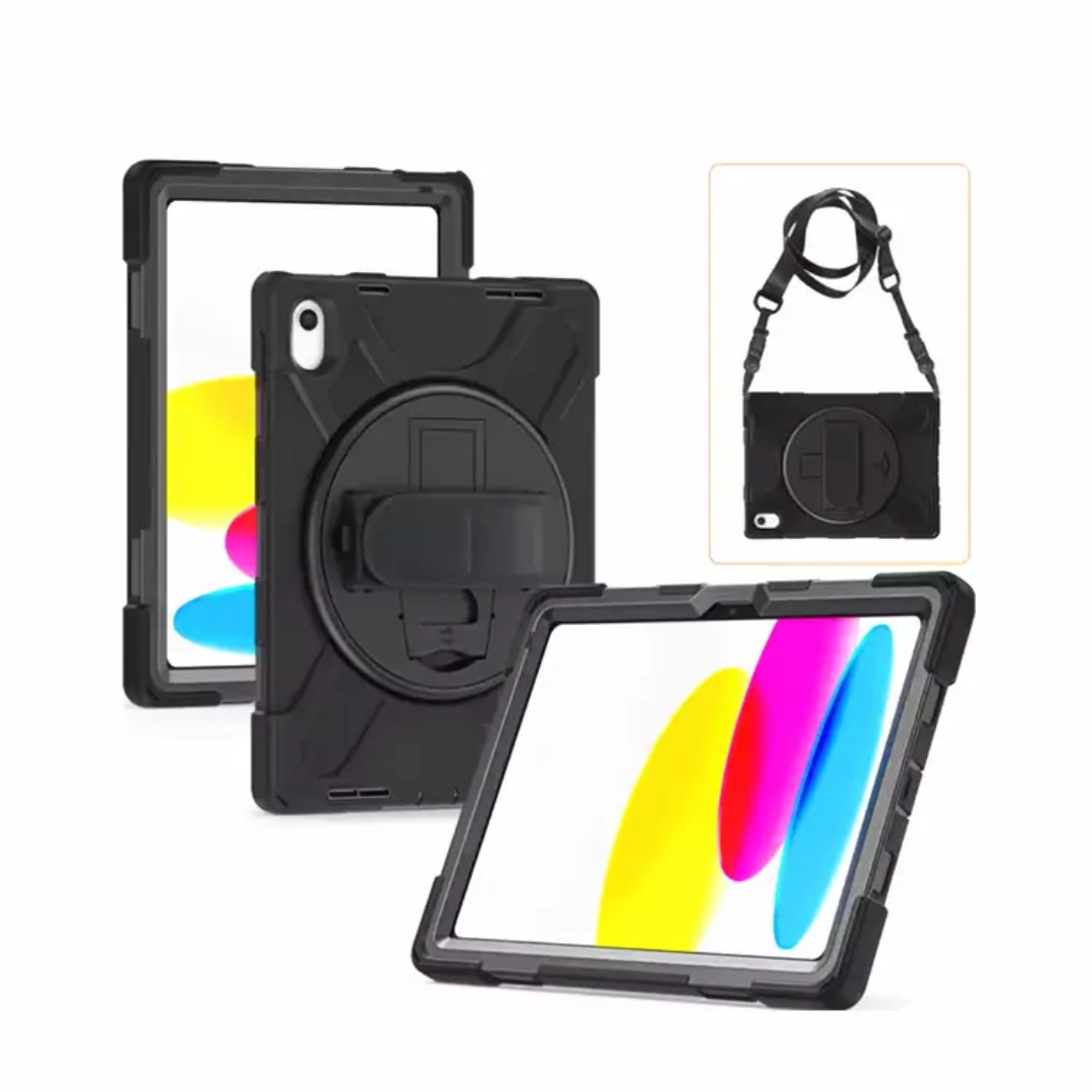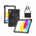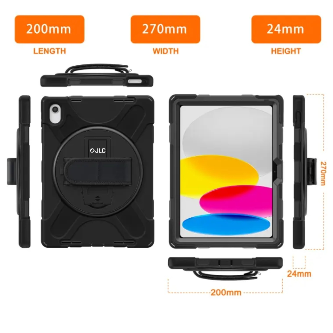 The JLC Apple iPad 10th 10.9 2022 Black Wolverine with Screen Case offers robust protection with a 3-piece design made of durable polycarbonate and flexible silicone to prevent accidental damage. It features a built-in screen protector to safeguard your device from scratches, dust, and other debris while providing full access to all tablet functions. The precise cut-outs for ports and buttons ensure easy access to all features without any hindrance. The case also includes a 360-degree rotatable kickstand and an adjustable hand strap, offering a versatile viewing experience and ease of use. For added convenience, the detachable 5ft shoulder strap allows for easy portability, whether vertically or horizontally. This case provides comprehensive protection for your iPad, making it perfect for both work and play.