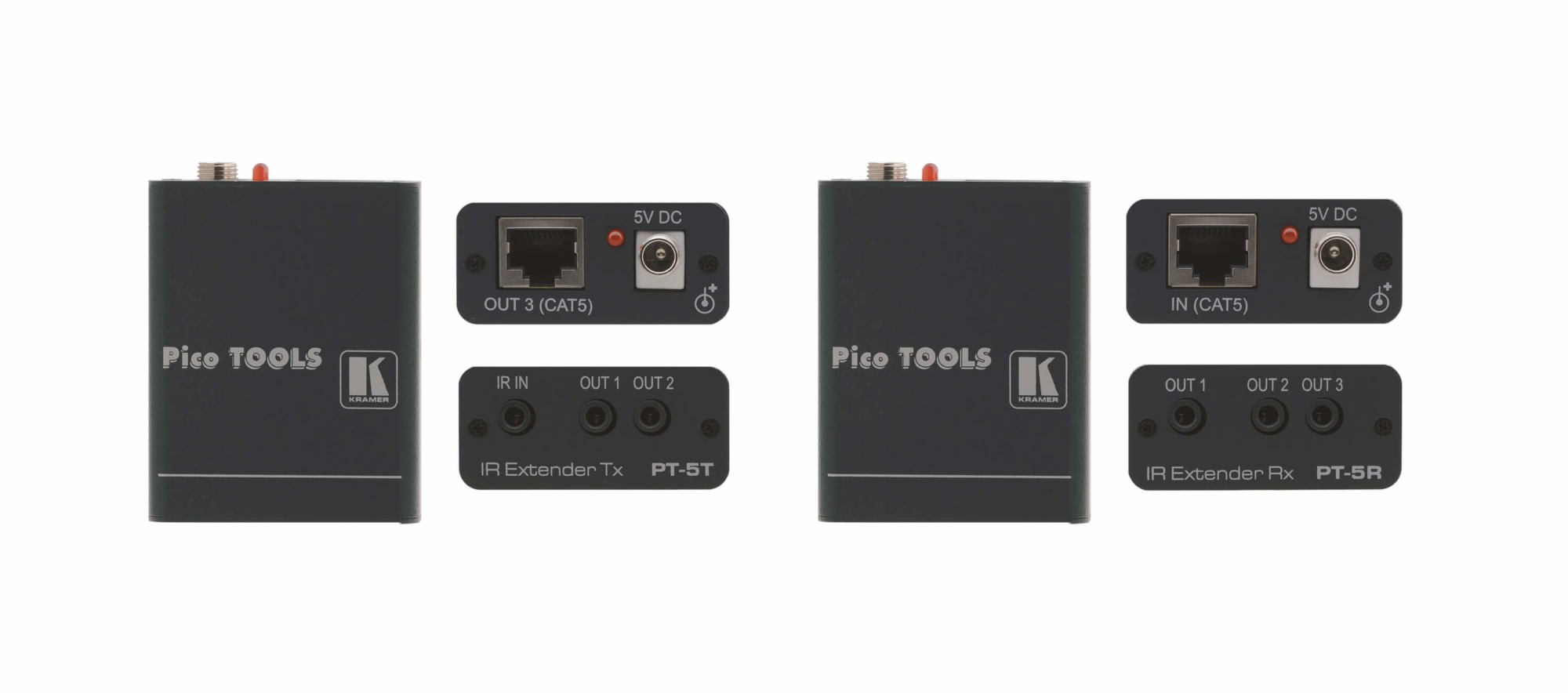 The PT−5T and PT−5R are a twisted pair transmitter and receiver for infrared signals. The units control up to five devices via their own remote control IR transmitters at distances of up to 250m (820ft) over twisted pair cable.