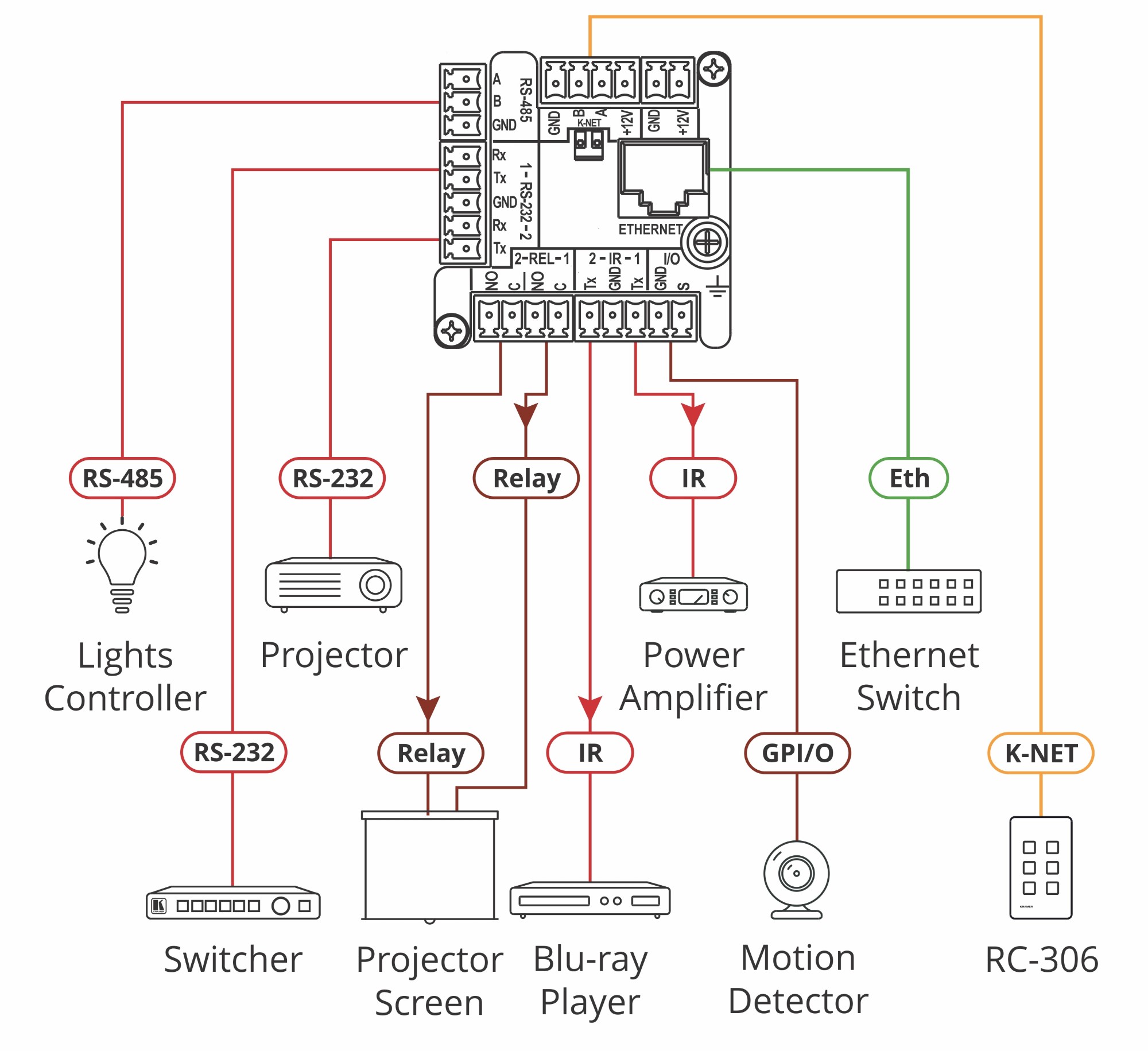 RC−206 is a compact 6−button control keypad that fits US, European and UK standard 1−gang wall junction boxes. Easy to deploy, RC−206 fits decoratively within a room design and is perfectly suited for use as a user interface keypad within a Kramer Control system. Using K−Config, tap into the rich, built−in I/O interfaces that enable this keypad to be used as a flexible, standalone room controller. In this way, it is ideal for classroom and meeting room control, providing end−user convenient control of complex multimedia systems and other room facilities such as screens, lighting and shades.