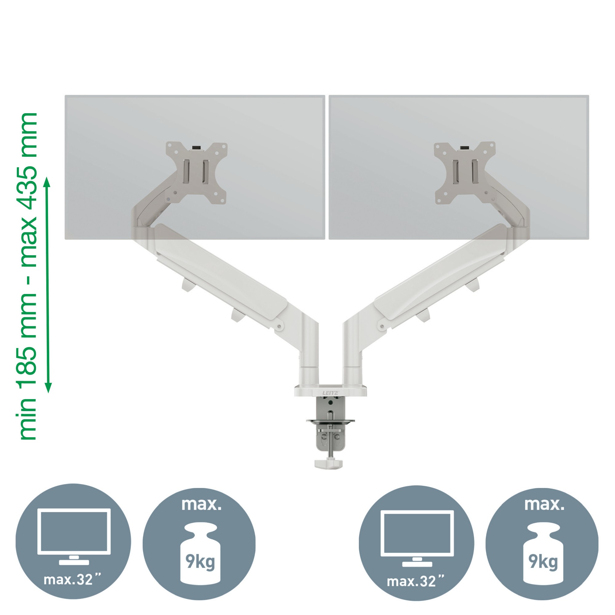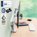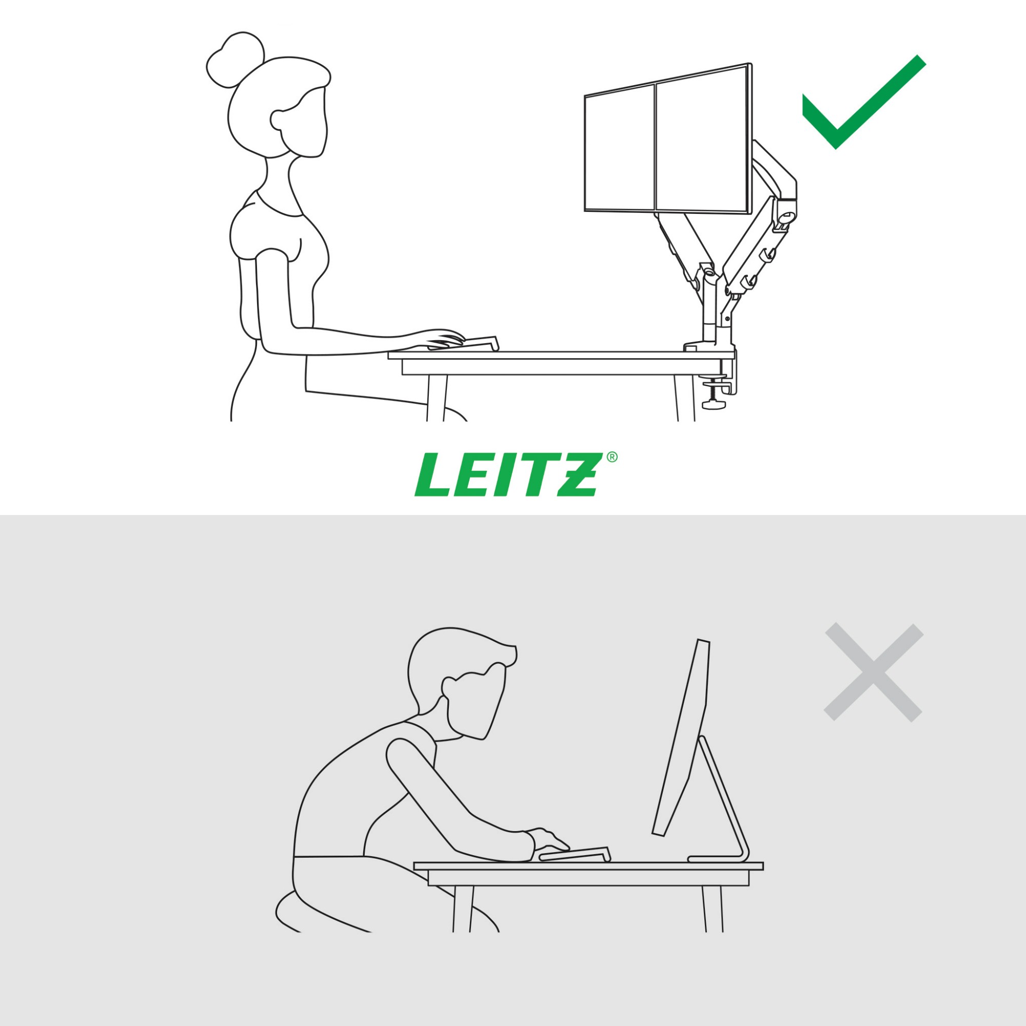The TÜV and IGR certified Leitz Space Saving Dual Monitor Arm has a positive impact on posture, promotes proper eye alignment and supports neck and shoulder comfort when the height of the monitors are adjusted correctly, and as recommended, to the ideal ergonomic position. The monitor stand remains stable at all heights and angles and can be easily switched between landscape and portrait mode. It's design is ideal for where space is limited and it will free up valuable desktop space thanks to its ultra versatile arms that can effortlessly fold flat, tilt and maneuver in any direction with just one hand. Ergonomically designed to promote wellness and increase productivity.
