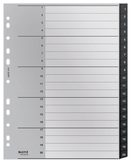 Premium quality extra wide A4 Folder Divider, 1-20 numerical tabs tabs. 90% (pre-consumer) recycled plastic and 100% recyclable. For clear organisation of A4 documents, helps in keeping track of important notes or school paperwork, for home, school or office use. This robust index perfectly complements other products from the Leitz Recycle range and is made to last. Modern and contemporary green stationery that will look great at home and in the office. With the eco friendly Recycle range from Leitz you can both improve your office environment – and the environment of our planet.