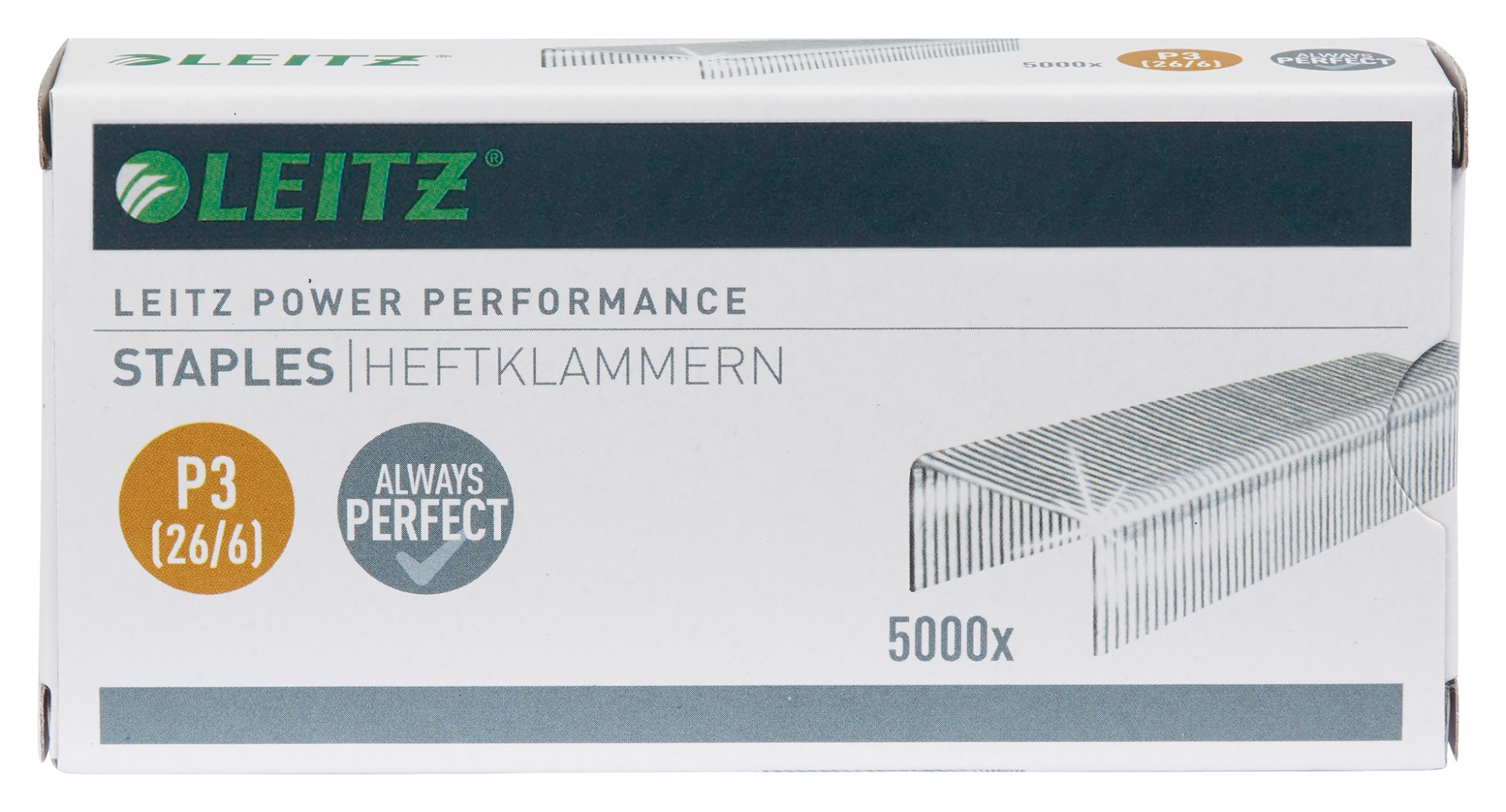 26/6 strong steel staples. Use with a Leitz stapler for optimum performance.