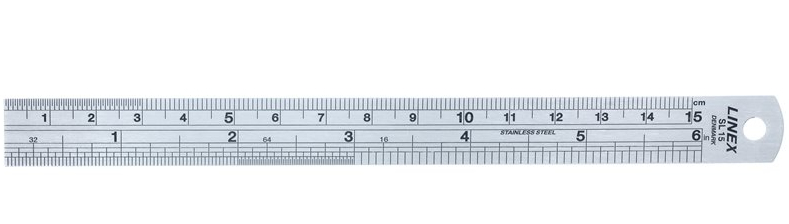 Stainless steel ruler with measurements in cm and inches. Conversion tables on the back page.