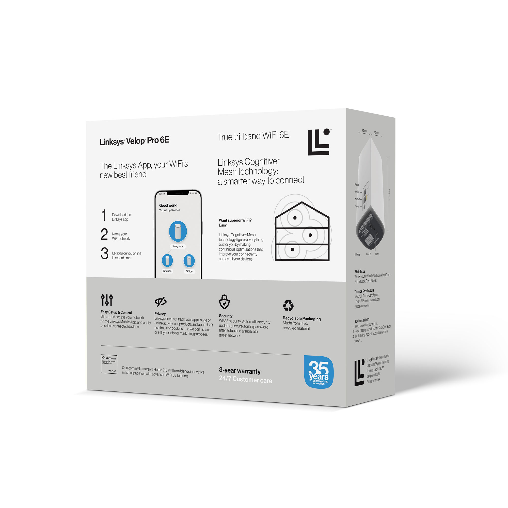 Each Velop Pro 6E node covers up to 3,000 sq. ft. or 1–3-bedroom houses and caters to 200 devices. As your needs grow, expand coverage conveniently by adding more Cognitive Mesh enabled nodes in hard-to-reach areas.