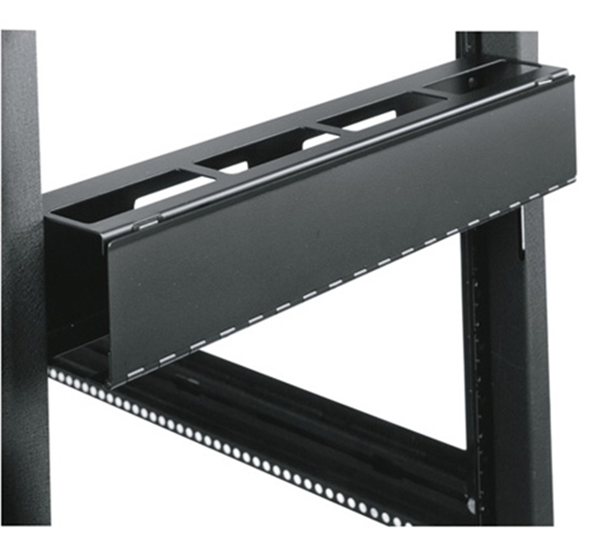 Conceal patch cables while providing cable strain relief with the hinged horizontal cable managers. These 19” cable managers provide a strong, attractive method for organizing patch cords and maintaining the required bend radius. The hinged front panel has a magnetic closure and conceals cables dressed between components and cable chases. Ample cable pass-throughs provided for dressing cables above, below, to the sides and behind the cable manager. Finished in a durable black powder coat.