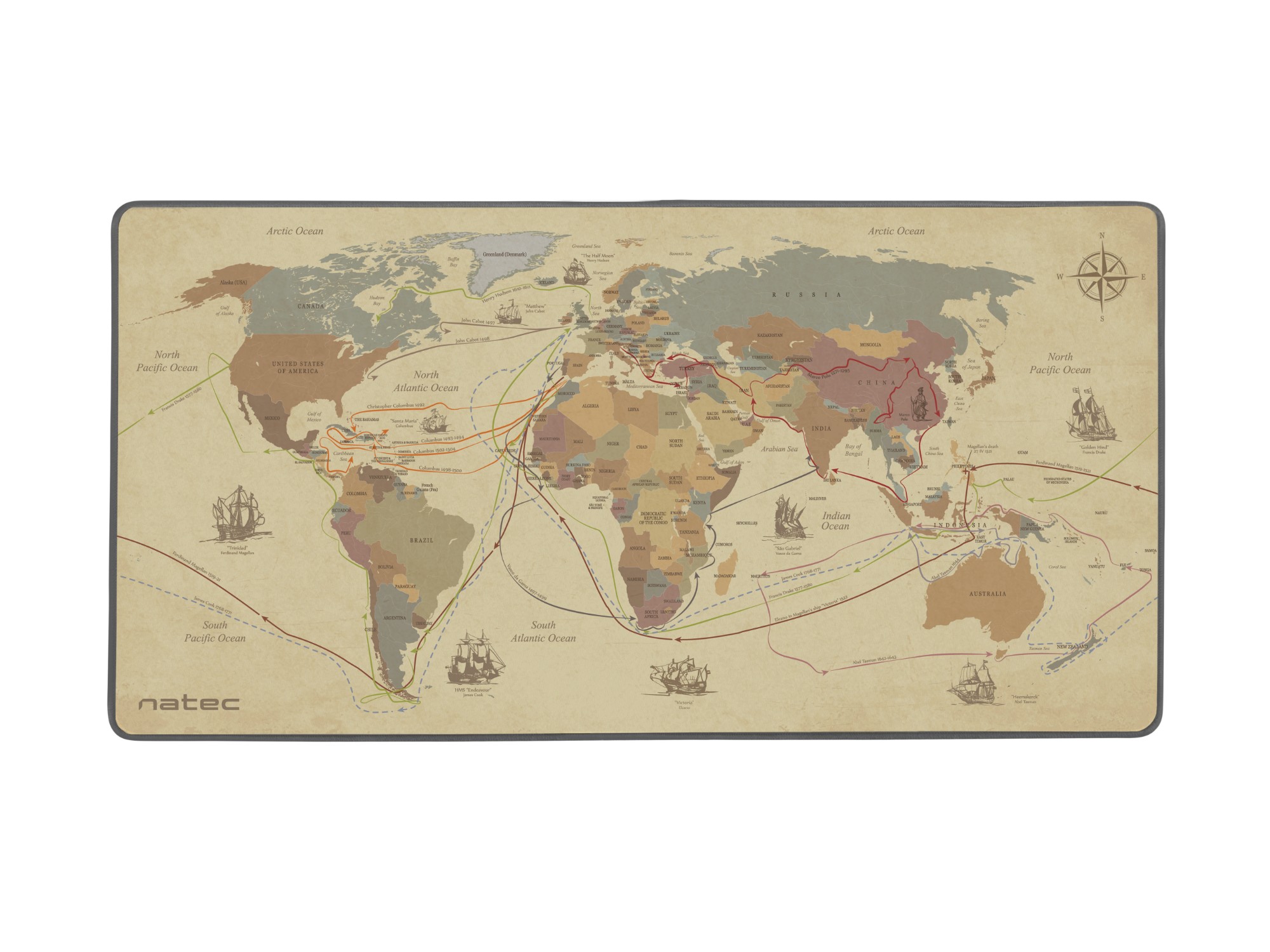 The main feature of Natec Discoveries is the unique design with the current political map of the world along with the main expeditions of the era of the great geographical discoveries. The routes include the names of the explorers, the dates of individual expeditions and the names and sketches of flagships.