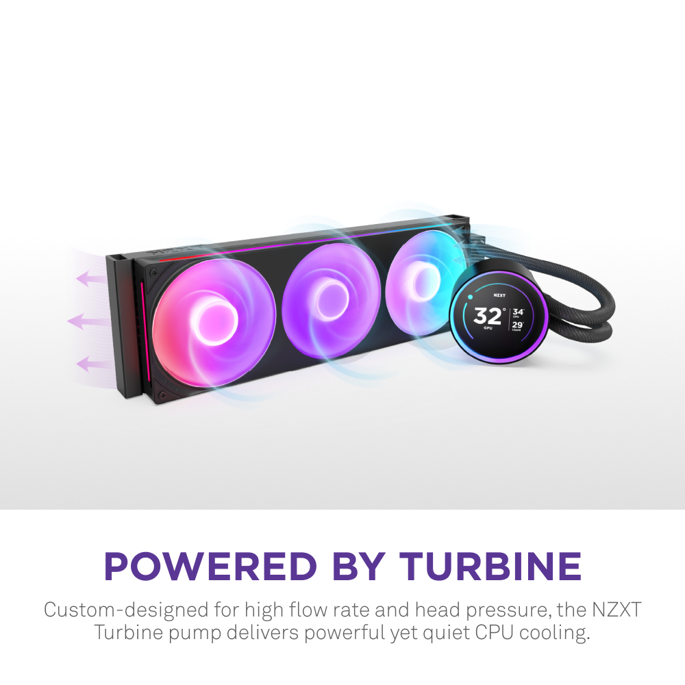 Custom-designed for high flow rate and head pressure, the NZXT Turbine pump delivers powerful yet quiet CPU cooling.
