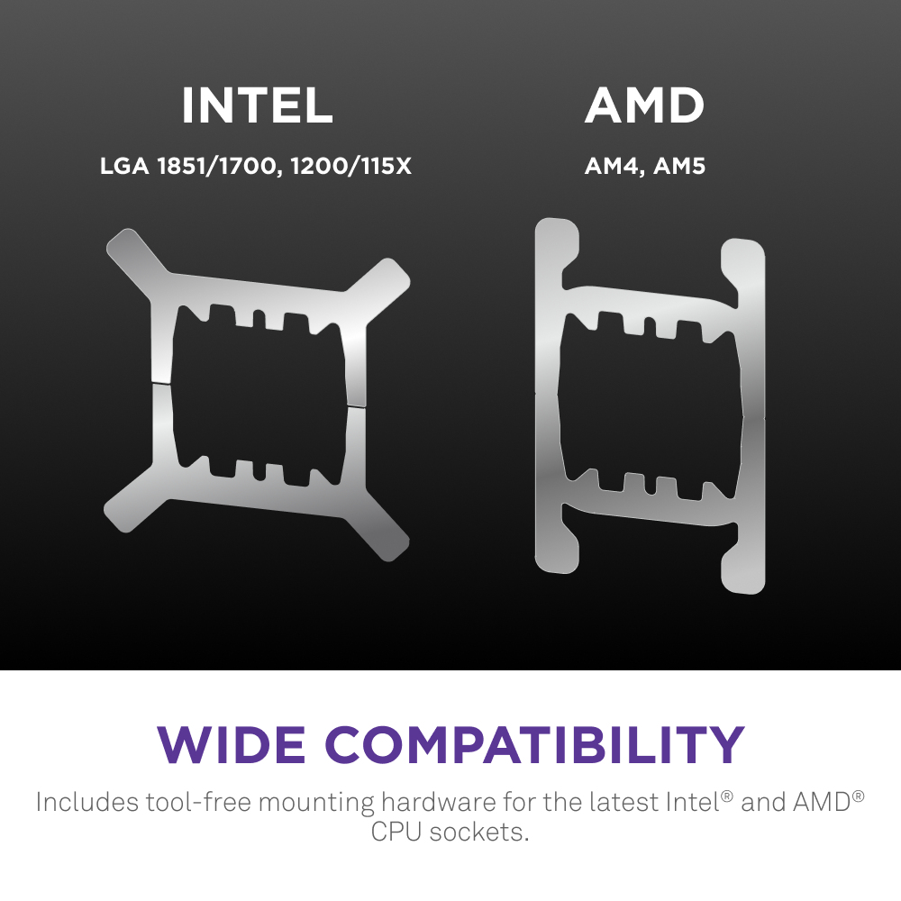 Includes tool-free mounting hardware for the latest Intel® and AMD® CPU sockets.