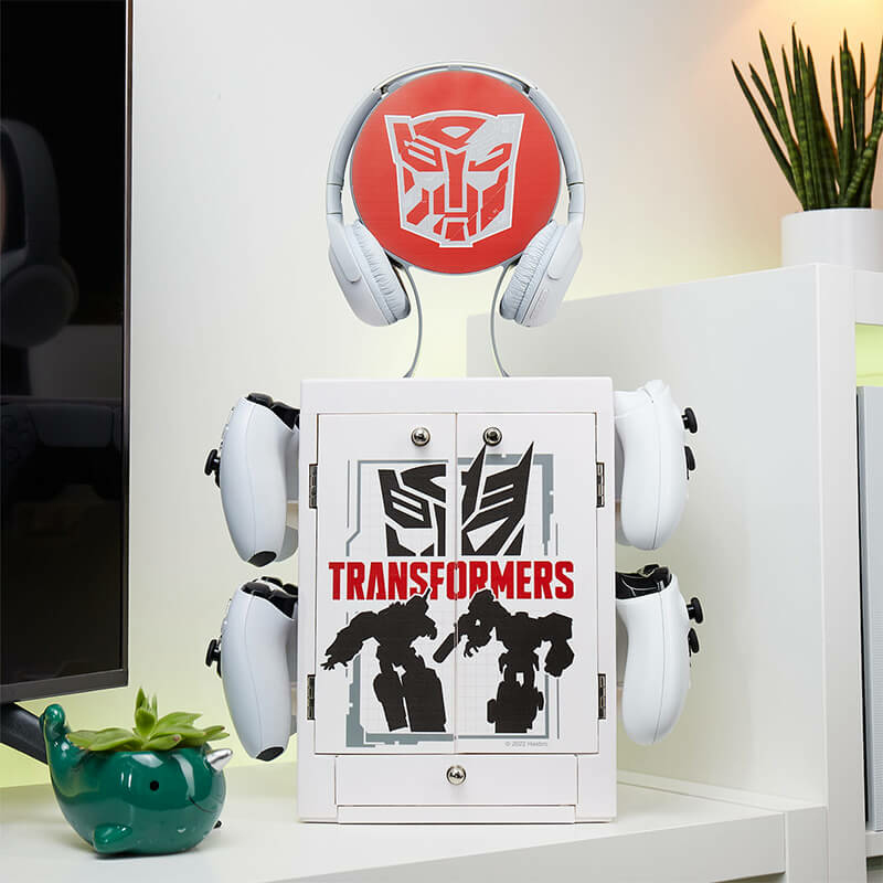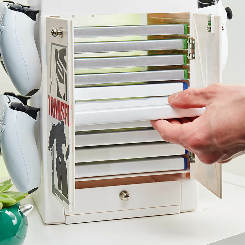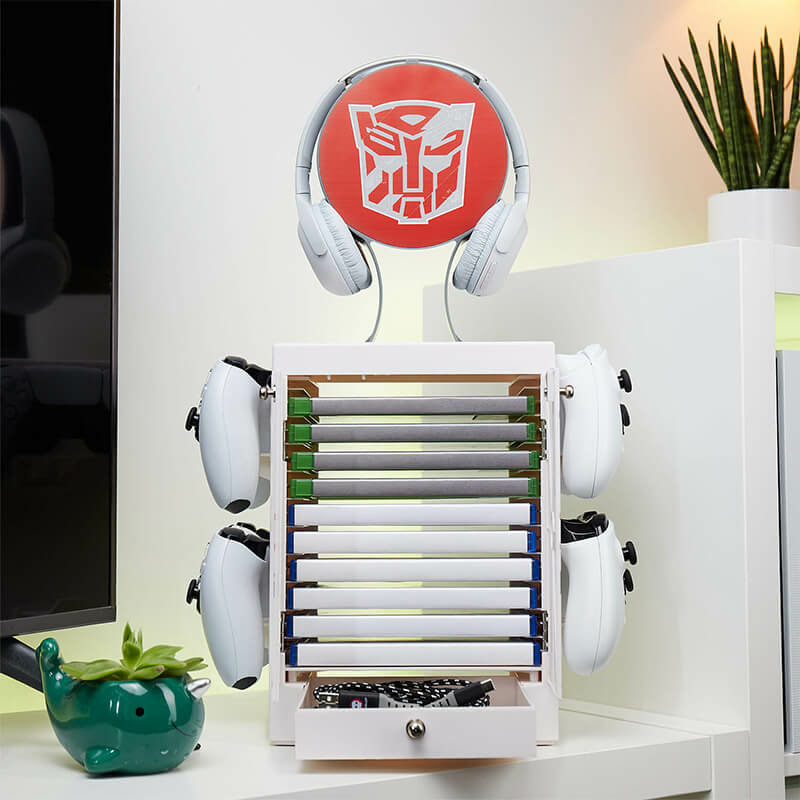 Transform your gaming space from untidy to tidy with this awesome Transformers gaming locker! Offering a storage solution for up to 10 of your favourite Xbox One/Xbox Series X|S games, PS4/PS5 games or movies, the locker also provides side mounts to allow up to four control pads to be neatly stored away. Cables, thumb grips and other gaming bits can be placed in the handy drawer in the base whilst headphones can be placed on the dedicated mount on the top of the unit.