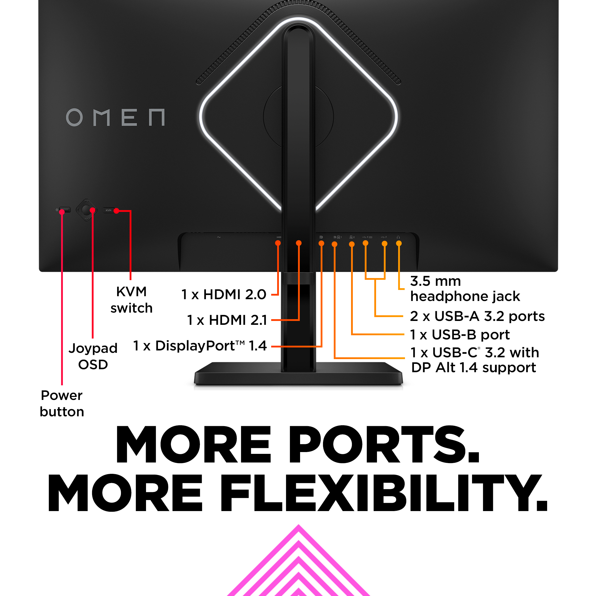Play, create, and enjoy whatever your heart desires with this centerpiece of fun—all in 4K[1]. Jump between 2 devices in a flash all while controlling both with the same keyboard and mouse, thanks to the built-in KVM switch[2]. Get stunning 4K visuals[1] on PCs, consoles, and more with the OMEN by HP 27-inch UHD 144Hz Gaming Monitor.