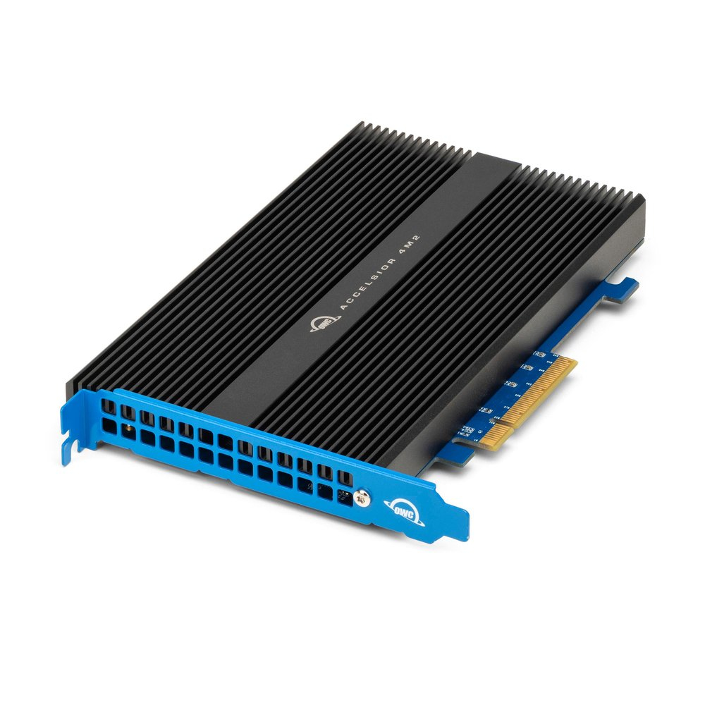 Accelsior 4M2 houses four OWC Aura P12 Pro NVMe M.2 SSDs under a finned heat sink cover that provides silent, throttle-free cooling. These “blade” style SSDs utilize Triple-Level Cell (TLC) 3D NAND with SLC caching and a Phison E12 controller with 7% over-provisioning.
