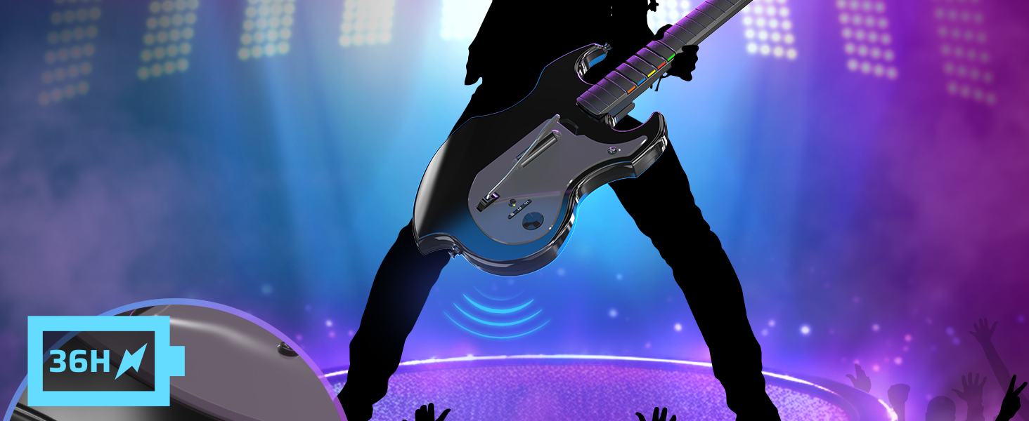 30-foot low latency wireless connection with built-in, rechargeable battery for up to 36-hours of play time per charge.