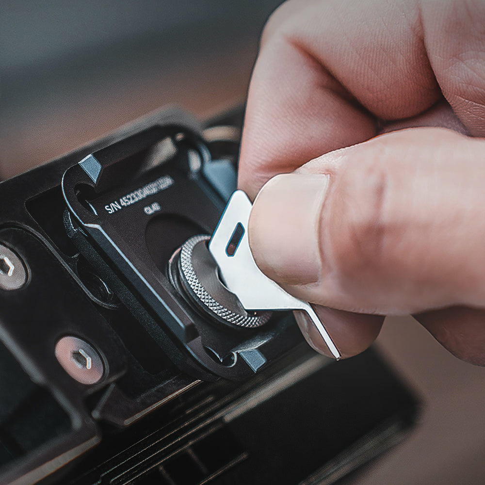 The standard multi-functional eject pin can easily remove memory cards and its unique design also doubles as a temporary slotted screwdriver for quick-release plates