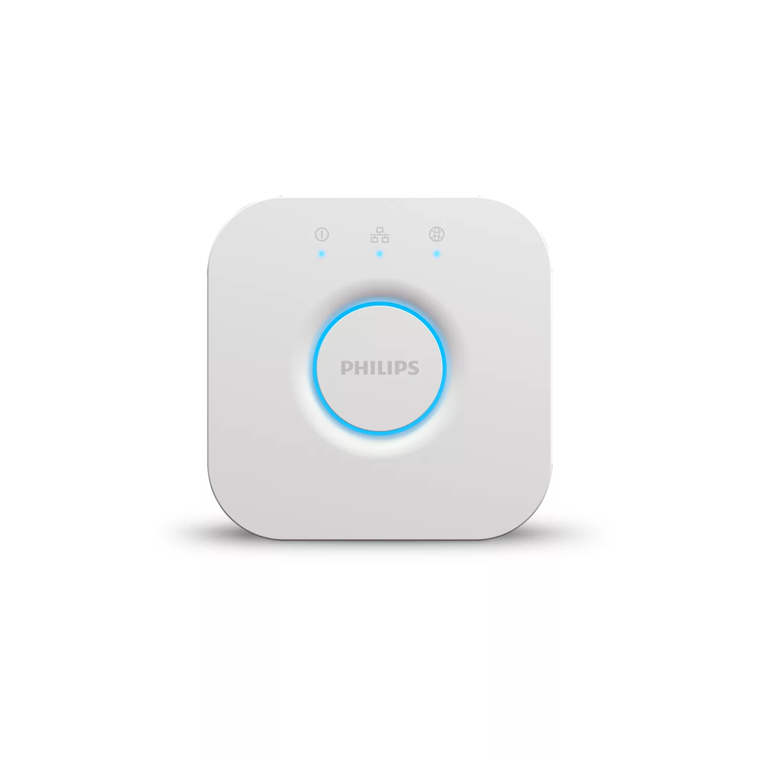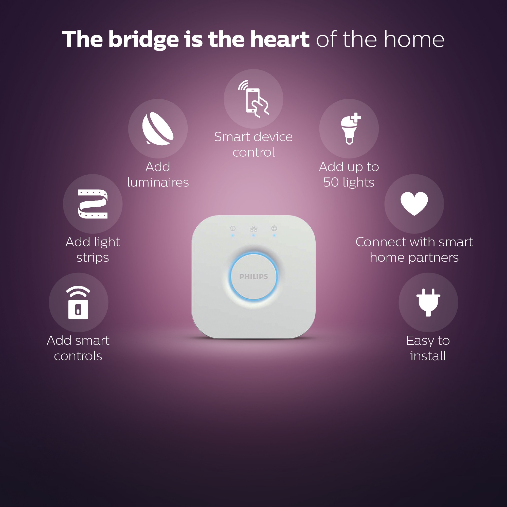 The brains of the Philips Hue smart lighting system, the Hue Bridge allows you to connect and control up to 50 lights and accessories. Simply plug it in and use the Hue app to set routines, timers, custom light scenes and more.