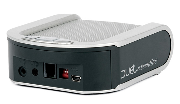 The Duet Executive is a USB and telephone desktop speakerphone. It has a built-in microphone and speaker, paired with advanced echo cancellation and noise suppression technologies, making it a very powerful yet portable tabletop VoIP and telephone conferencing solution.
