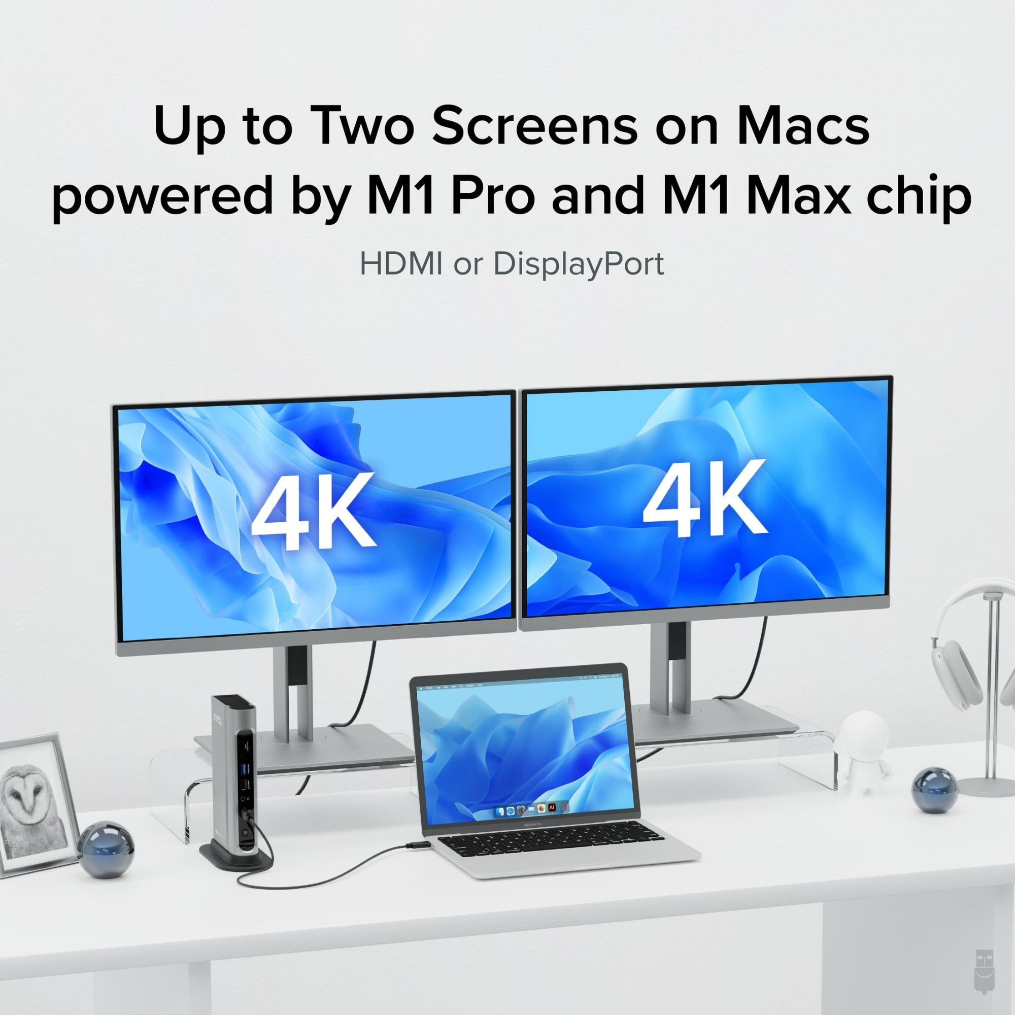 On Mac (Intel, M1 Pro/Max CPU), extend your desktop to 2x screens using any combination of HDMI and/or DisplayPort. Macs with an M1 or M2 CPU only support one external display.