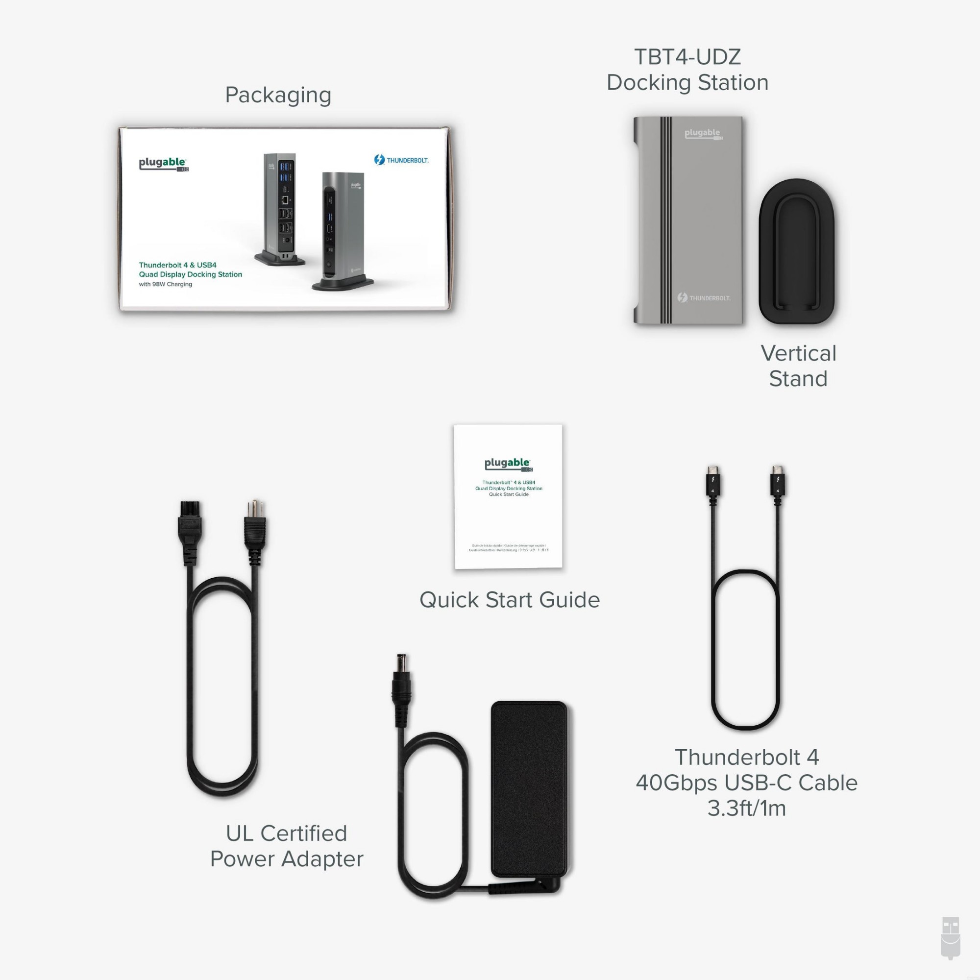 The Thunderbolt Certified 16-in-1 Quad docking station from Plugable delivers peak performance. The innovation starts with our display connections. Connect your 4K screens through 2x HDMI ports and 2x DisplayPort ports — a rare level of display flexibility in a Thunderbolt dock. But the real expansion picks up at the ports. Offering sixteen total ports to park your peripherals, including 7x USB ports, SD and microSD card readers, Audio, and 2.5Gbps Ethernet. It even adapts to your desk with an included stand for vertical or horizontal orientation options.