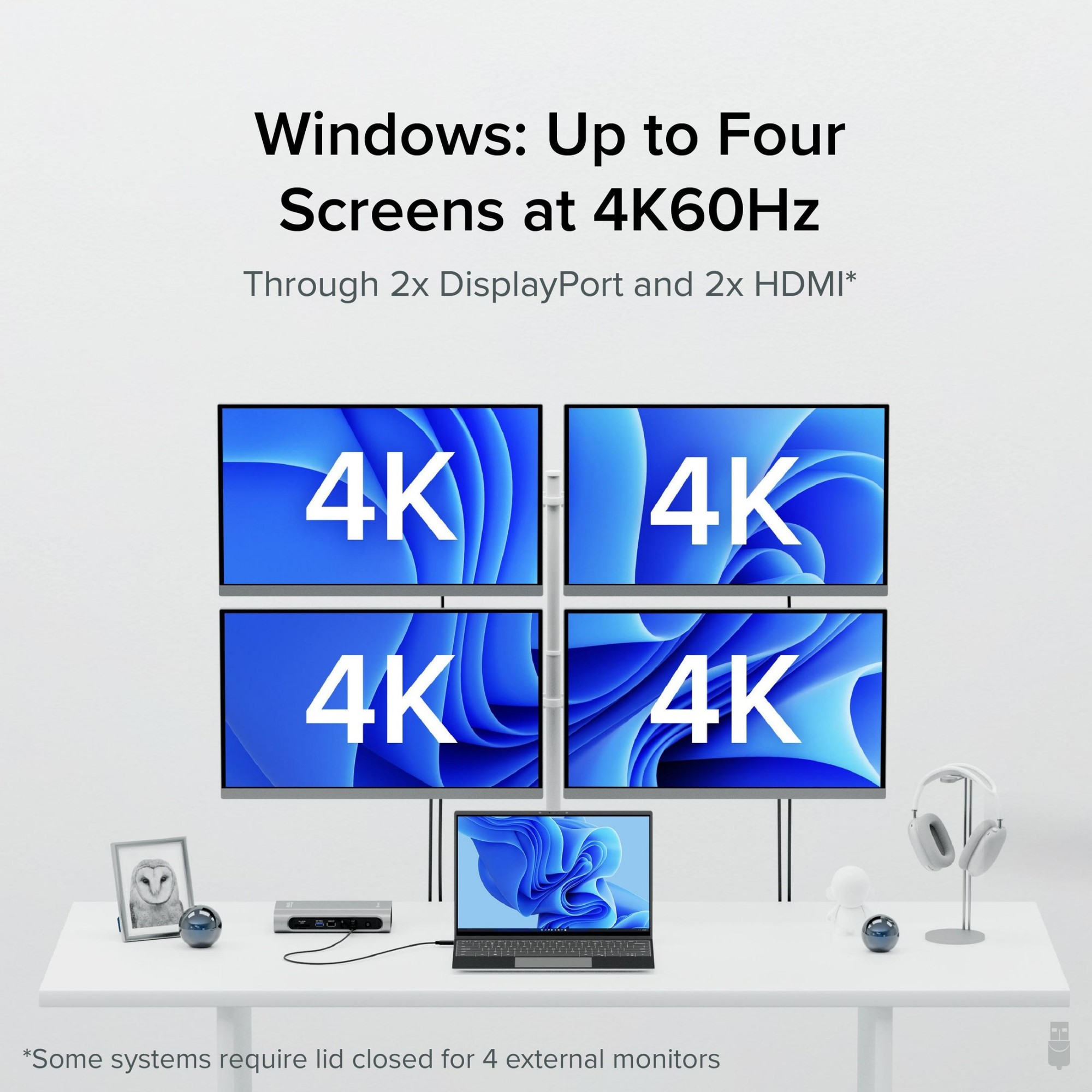 With this Thunderbolt 4 docking station Windows computers can use the 2x HDMI ports, and 2x DisplayPort ports to connect as many as 4x screens at up to 4K 60Hz. Can also be used a single, dual, or triple display docking station.