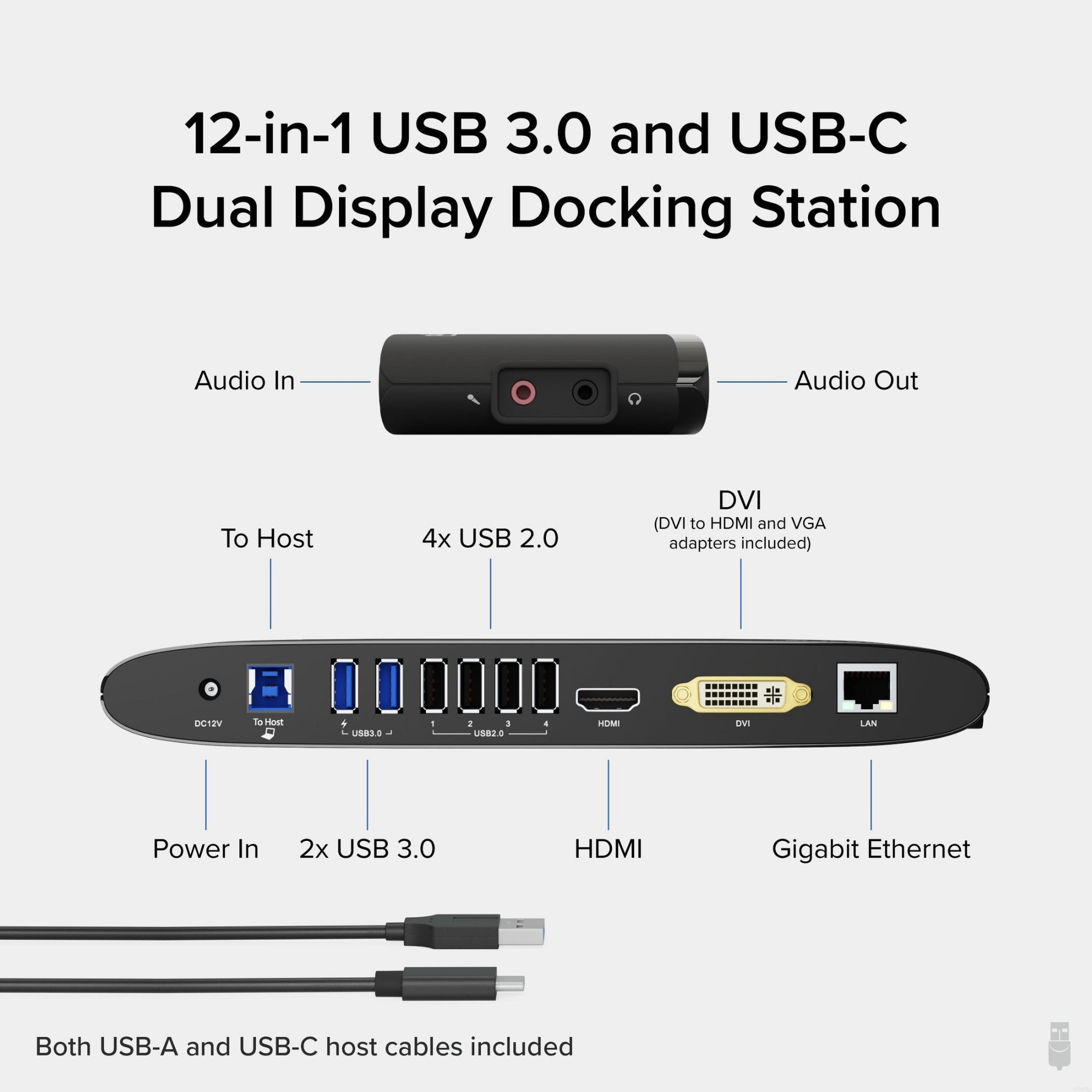 USB 3.0 Universal Laptop Docking Station for Windows and Mac (Dual Monitor: HDMI and DVI/HDMI/VGA, Gigabit Ethernet, Audio, 6 USB Ports) - Horizontal