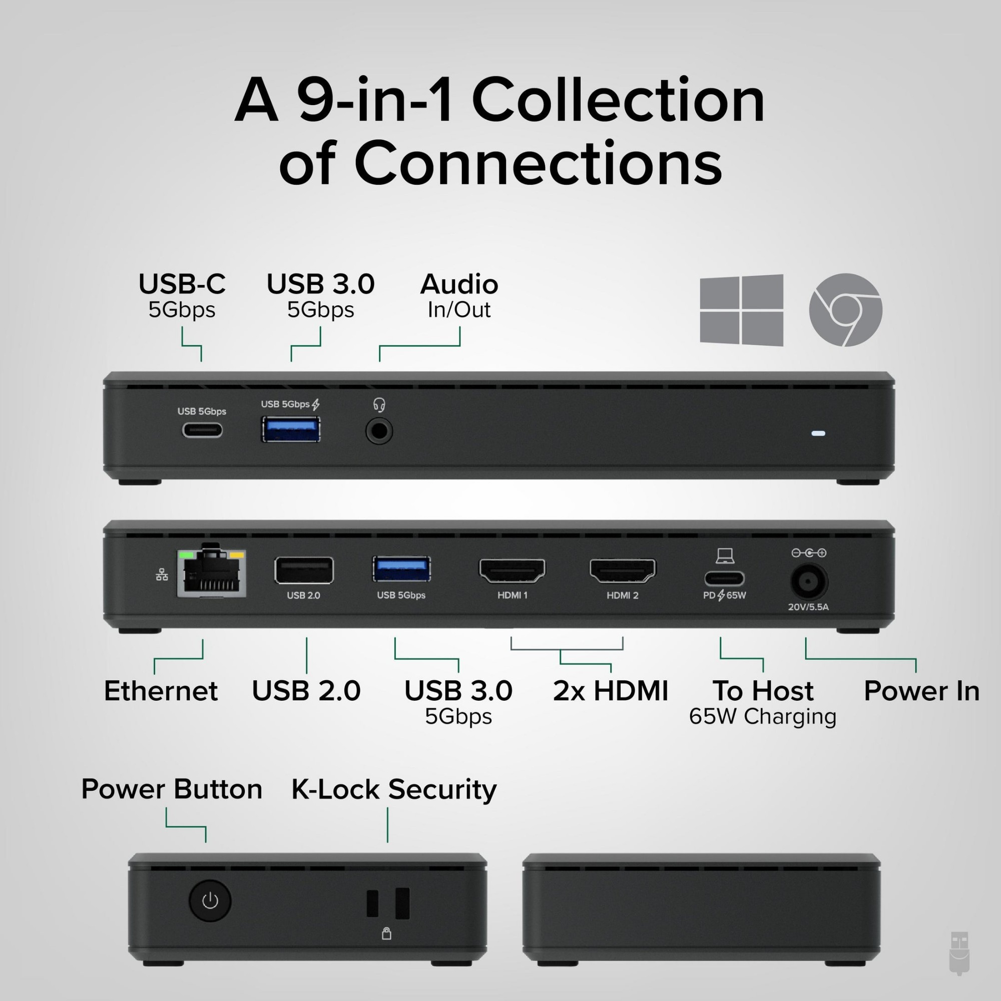 Screens aren’t the only thing you’ll be connecting to this Plugable USB docking station dual monitor. A USB-C port (5 Gbps) for your modern devices, 2x USB (5 Gbps), and a USB 2.0 (480Mbps) for your legacy devices. And of course, ethernet and an audio jack – between flaky Wi-Fi and wireless headphones that never seem to be charged, sometimes it’s best to have a backup.