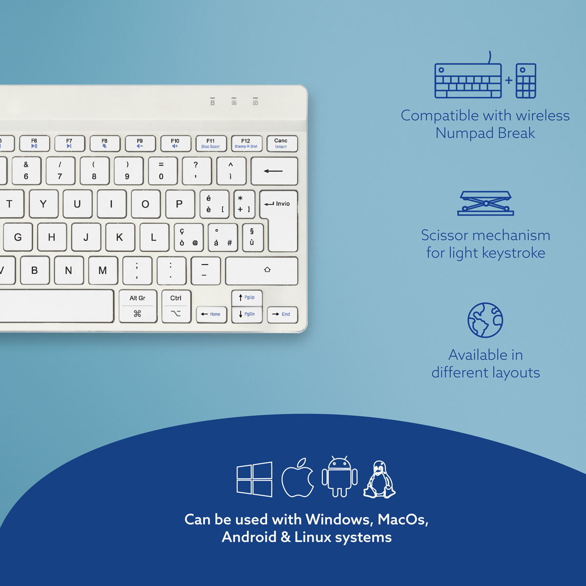 The Compact Break keyboard has an ultra-thin design. This ensures that the blood vessels and tendons in the wrists are not pinched while typing. The keys have a special scissor mechanism so the keystroke is very light and you need less force to type.