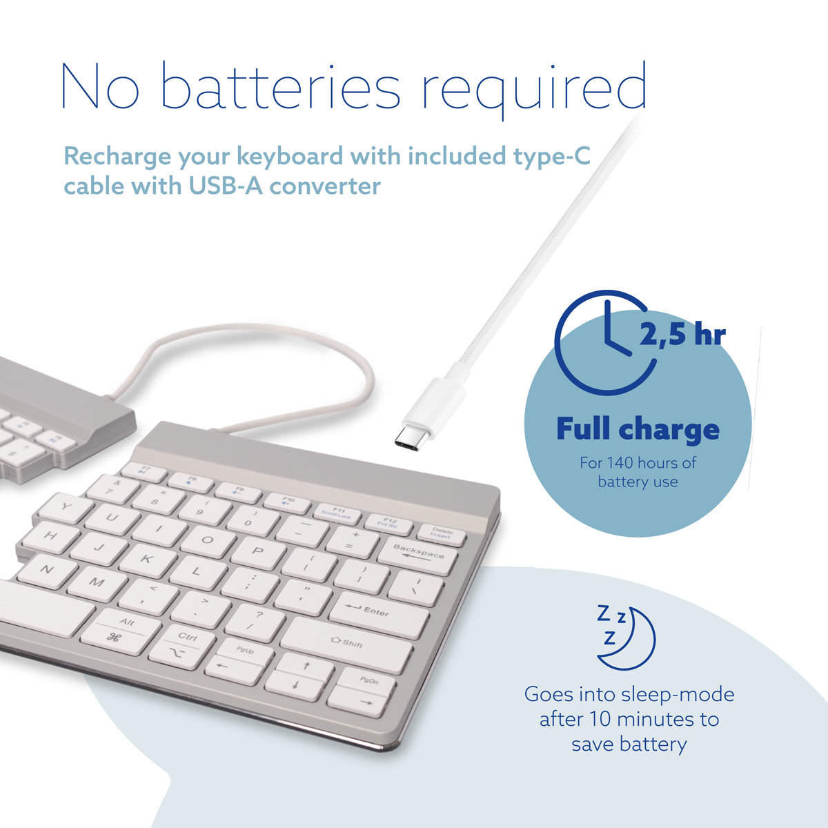 The Split keyboard is ultra-thin, so you don’t strain and oppress the blood vessels and tendons in your wrists while typing. The special scissor mechanism in the keys ensures a light keystroke, so less strenght is needed to press the keys. As a result, the fingers are more relaxed while typing.