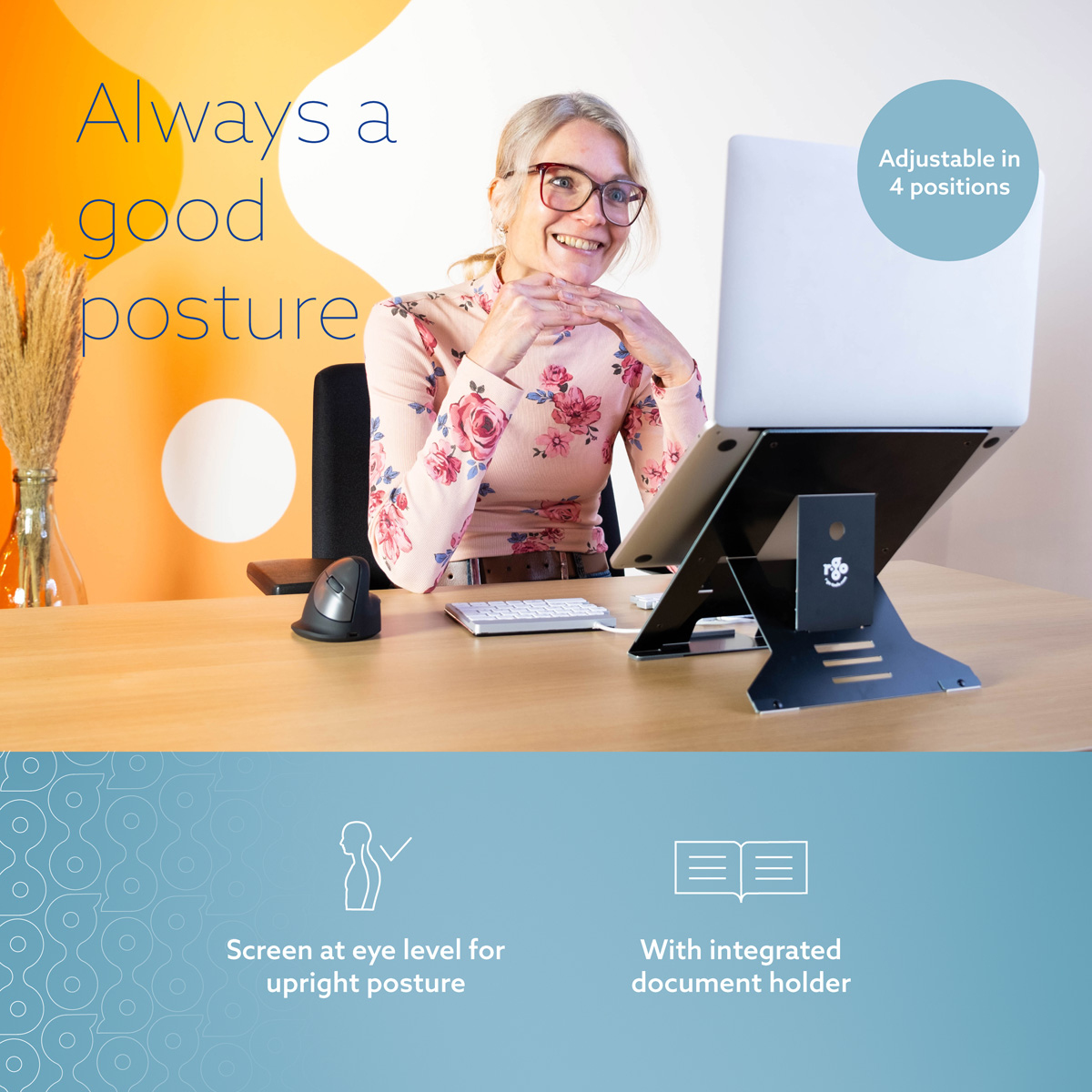 This laptop stand has 5 different positions and is easy to set up as desired. This allows you to work at eye level and prevent a hunched working posture. Very comfortable for use in the office, at home or on the road.