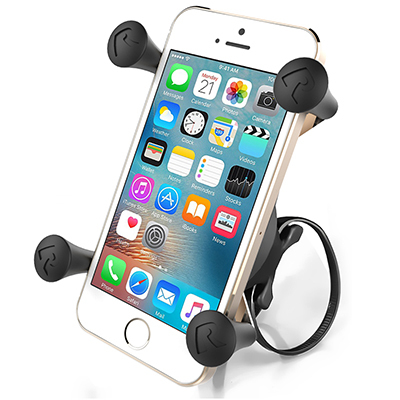 Optional Tether Included No matter where your adventure takes you, it is highly likely that your smartphone is within hands reach. For the outdoor biking enthusiast, the RAM Universal Bike Mount is the most complete mounting solution for attaching a smartphone to your bike. Compatible with most any smartphone, the X-Grip cradle has a clean and clever four leg design that sports great holding power, but also allows for easy insertion or release of your phone. Designed to fit most common handlebar sizes, the included base uses common zip ties to attach to a variety of handlebar diameters. Made of high strength composite, it is light weight too. Adjustable to allow for the best viewing angle, this product is perfect for any cyclist or open trail adventurer. The X-Grip includes a device tether recommended for outdoor applications. The cradle is compatible with handheld devices that will fit the dimensions listed below. It is important to verify the dimensions of your handheld device with a case/sleeve/skin when determining the overall size. Cradle Dimensions Minimum Width = 1.875" (Minimum Height = 4.25") Maximum Width = 3.25" (Minimum Height = 2.25") Depth = 0.875"