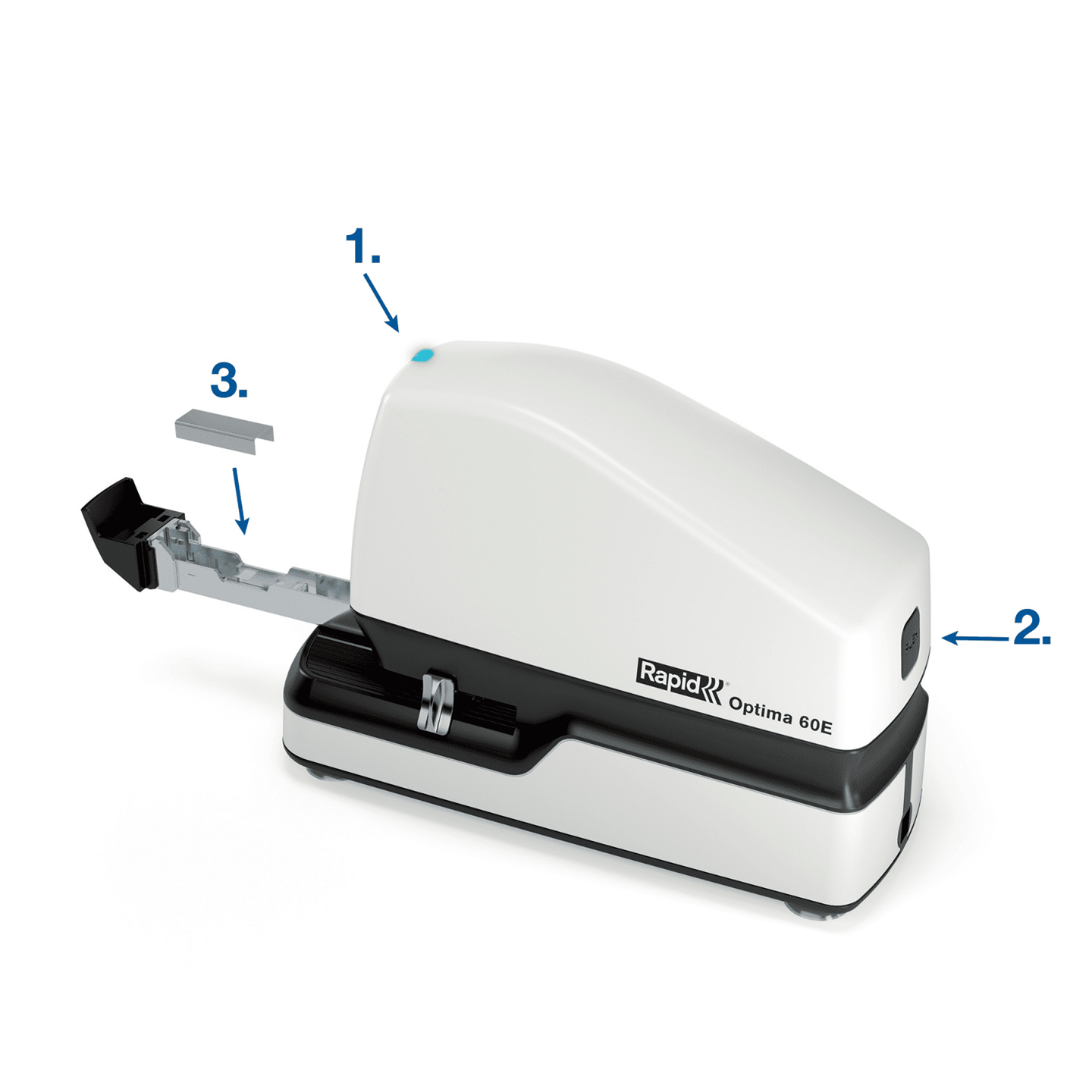 The Optima 60E provides powerful and hassle-free stapling. Effortlessly staple a stack of up to 60 sheets of paper in one go (80 gsm), saving you time at home or work. This compact full strip stapler is fully automatic, ensuring hygienic stapling due to no touch contactless operation. The adjustable paper insertion depth and printed staple placement guide allows flexible yet precise staple placement. Never run out of staples with the LED low staple indicator and ensure jam-free stapling when using Optima HD 70 staples (20 - 60 sheets) or Optima 56 staples (2 - 20 sheets). Powered by a mains adaptor (included). Supplied with a box of 5000 x Optima HD70 staples.