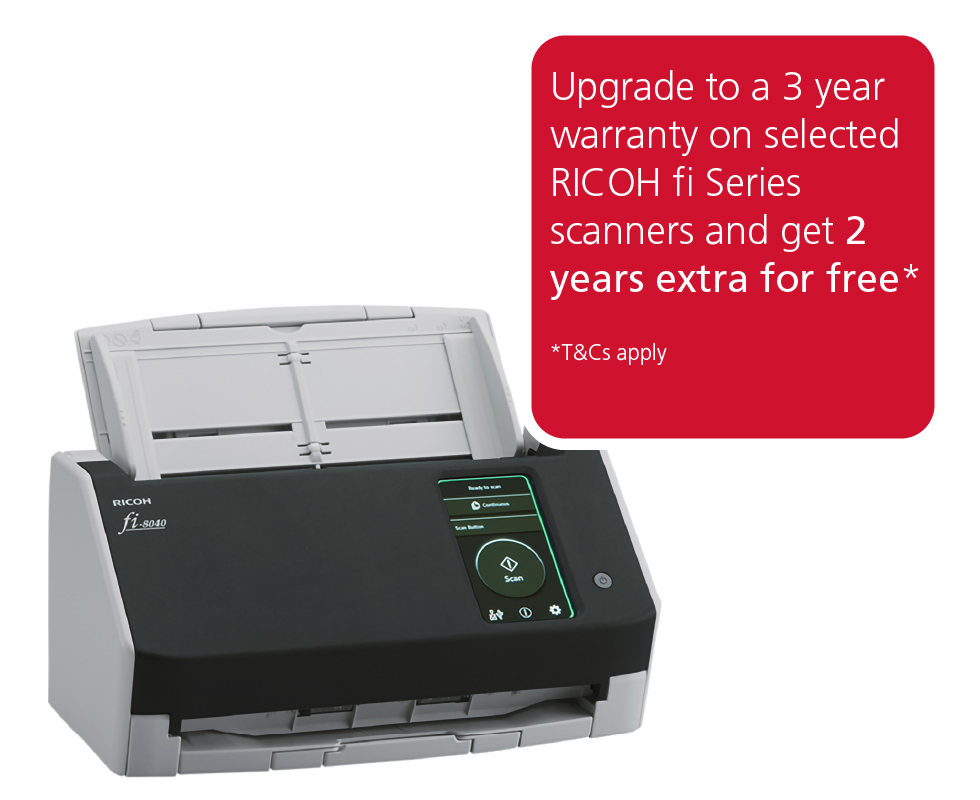 Upgrade to a 3 year warranty on selected RICOH fi Series scanners and get 2 years extra for free*<br>*Ends 30/06/26. T&Cs apply. Claim offer - https://service.pfu-emea.ricoh.com/s/register-an-asset