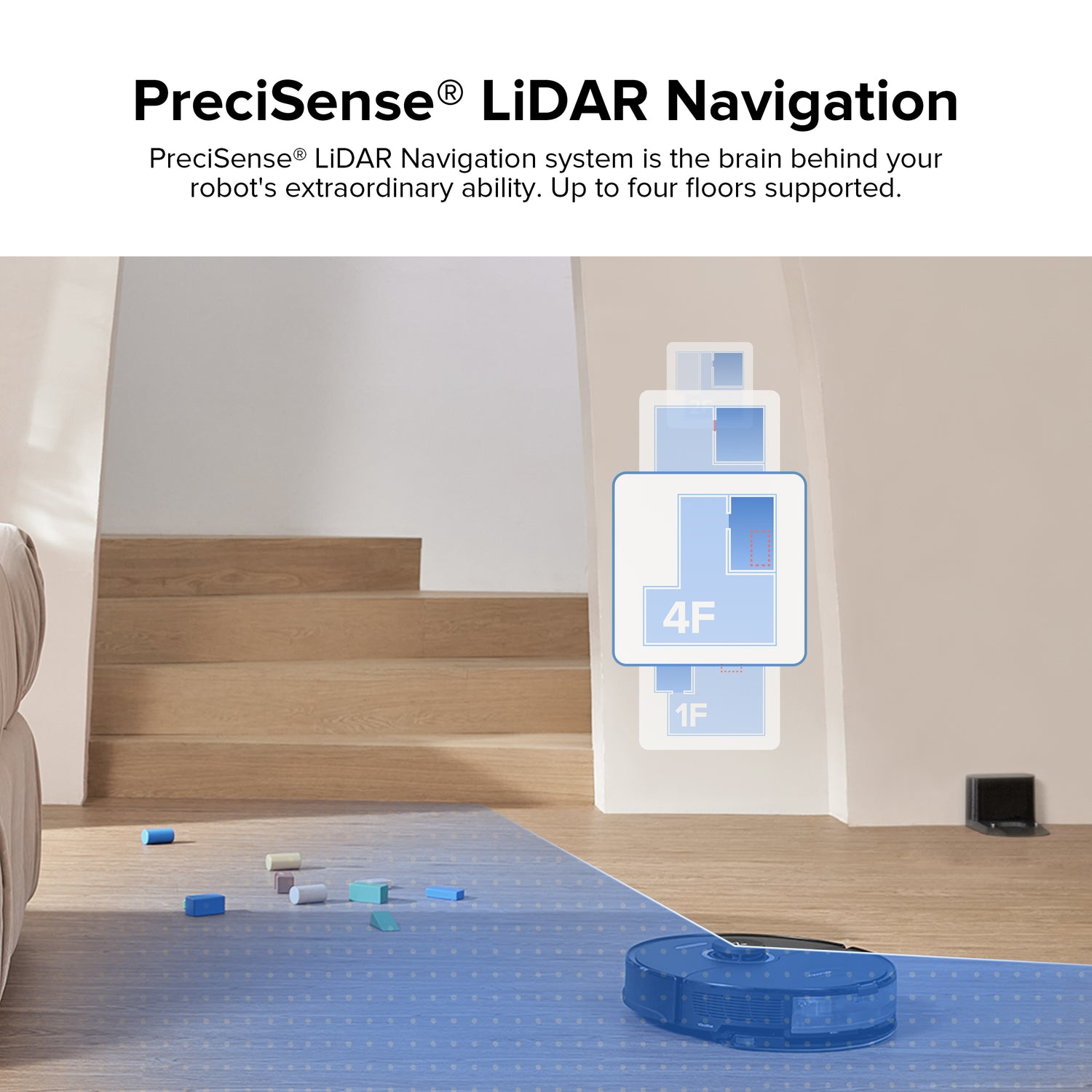 PreciSense® LiDAR Navigation system is the brain behind your robot's extraordinary ability. It’ll scan and create detailed maps to find an optimal route to clean your home, leaving dirt with no escape.