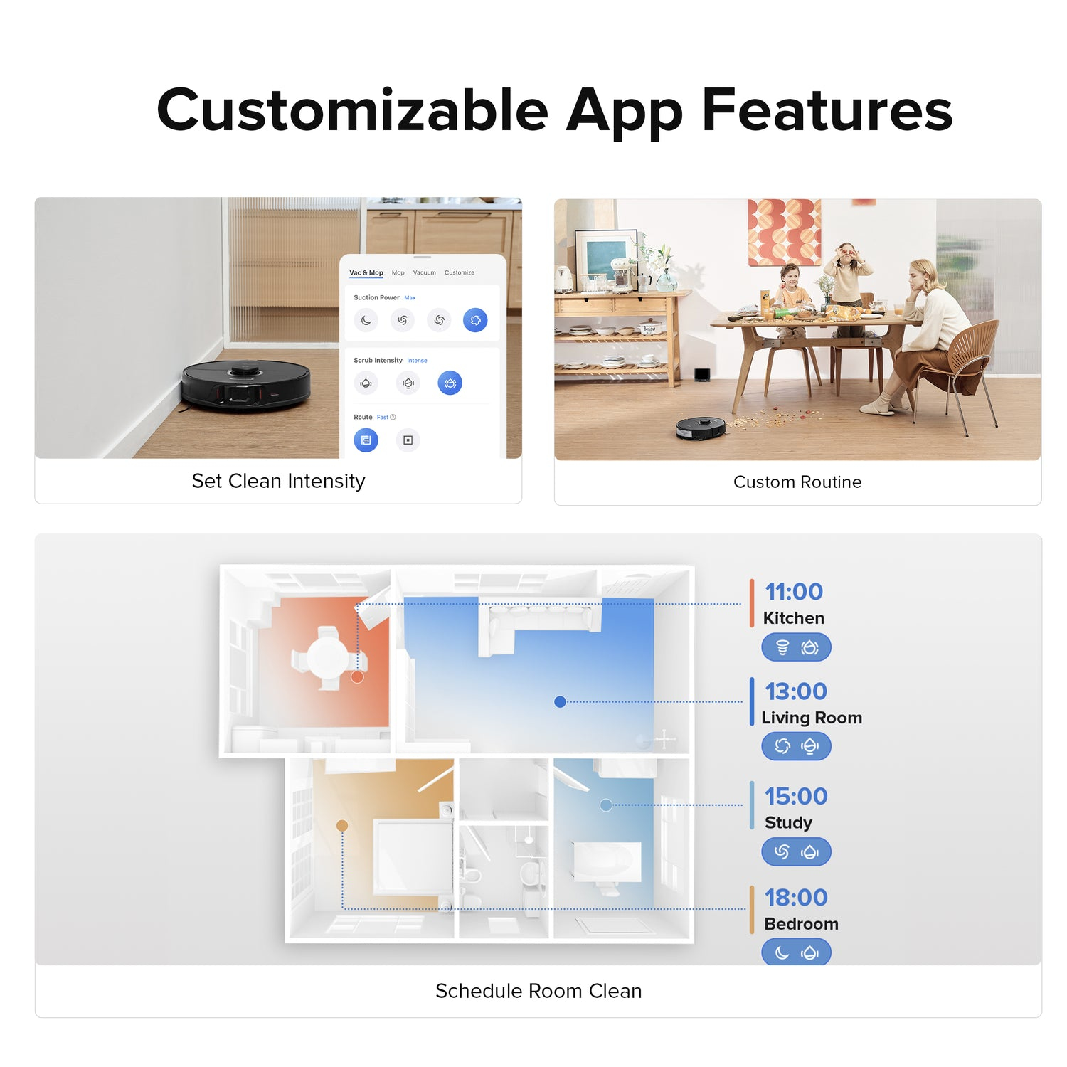 Decide on your time when the robot vacuum cleans with custom cleaning schedules, and set cleaning routines for particular areas in the house regularly or on demand.