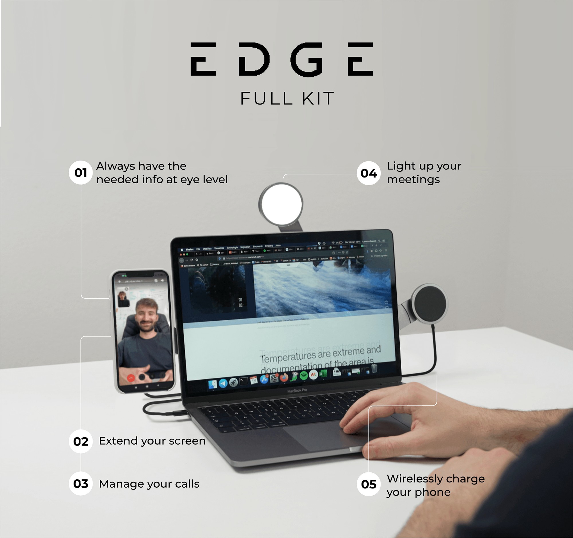 EDGE® is the best laptop and tablet accessory that helps to boost productivity while working on the go. It offers hands-free phone accessibility, to extend your screen and always have the needed information at eye level, as well as charging your phone and lighting up your Zoom meetings