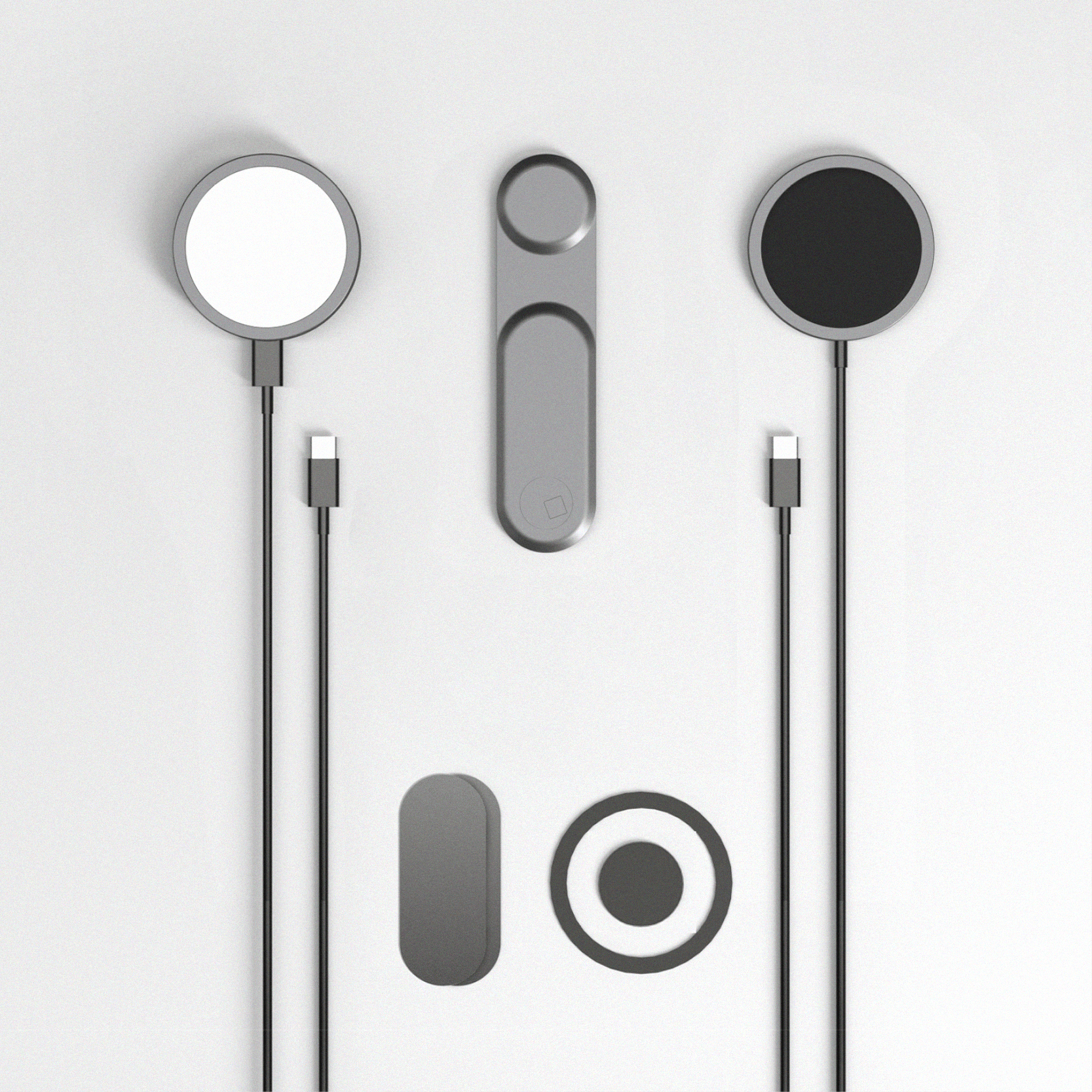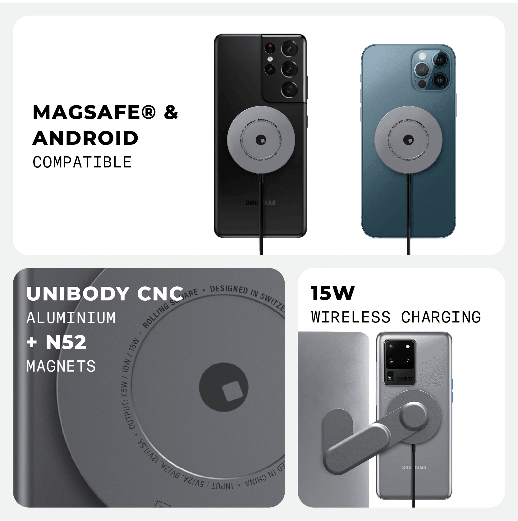 Our Universal Wireless Charger is made of unibody CNC machined aluminium, with N52 magnets and an ultra gripping layer on the front surface.
