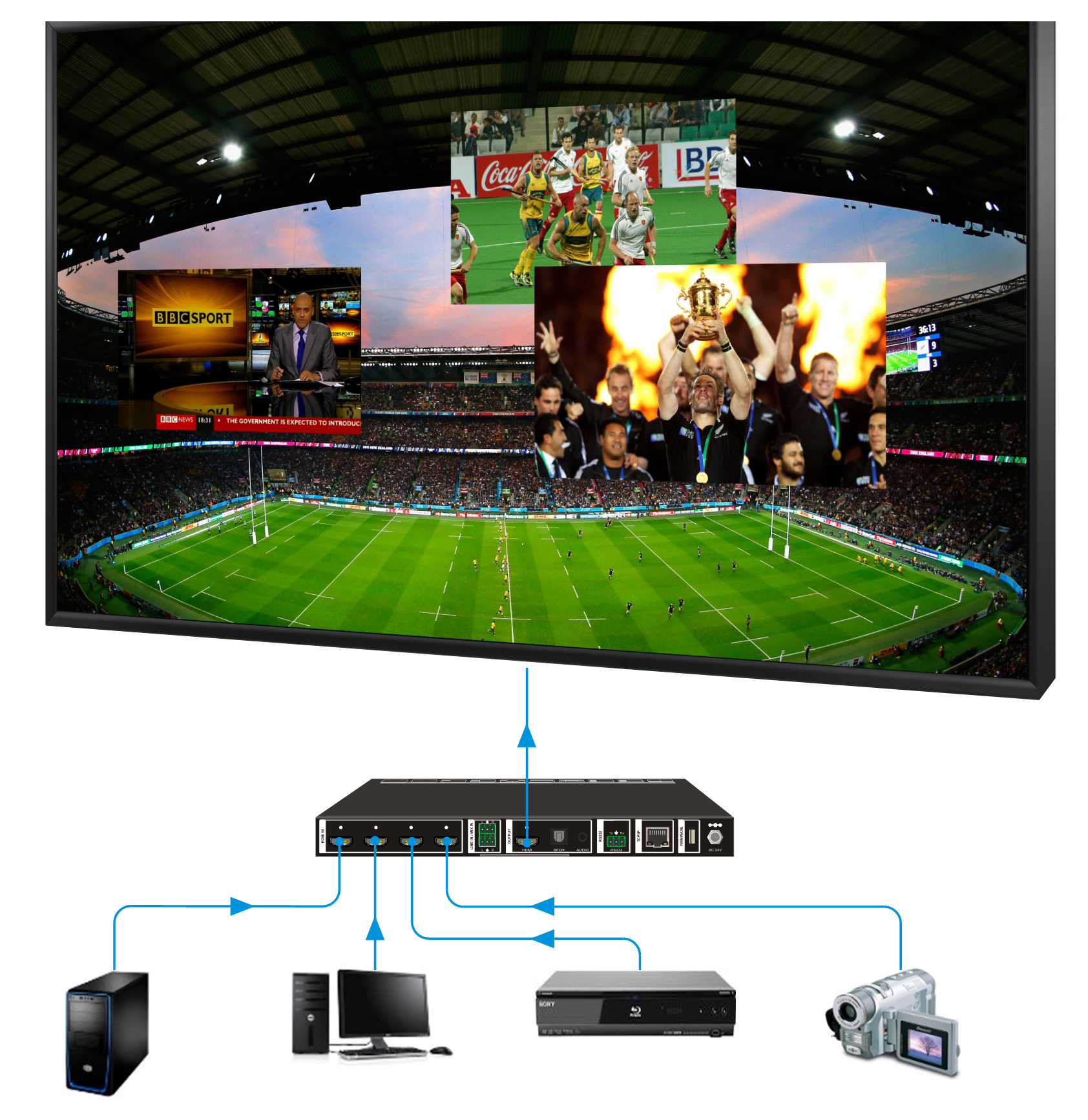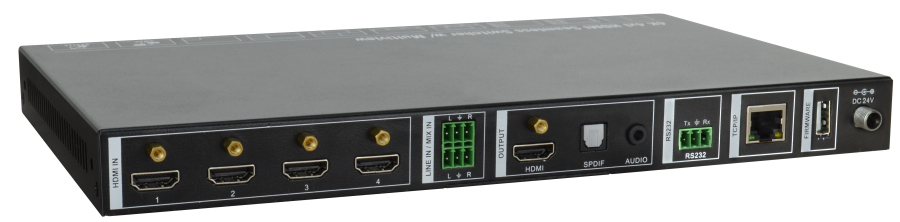 The SD-MV-CM41 multiviewer is designed to display multi video inputs onto one display. It features four HDMI inputs supporting up to 4K and one HDMI output with resolution up to 4K as well. It also provides a line input, 1 mix input, 1 SPDIF output and 1 analog output for audio processing. It is extremely flexible and seamless switching capable multiviewer making it perfect for applications such as broadcasting, security, boardroom, TV studio and so on.