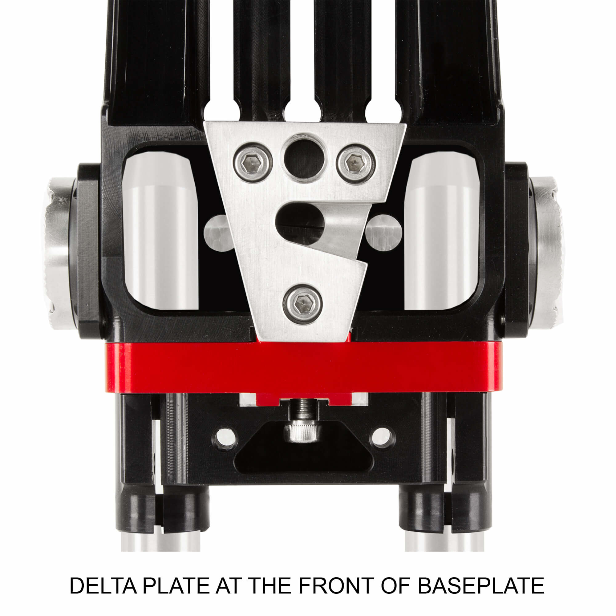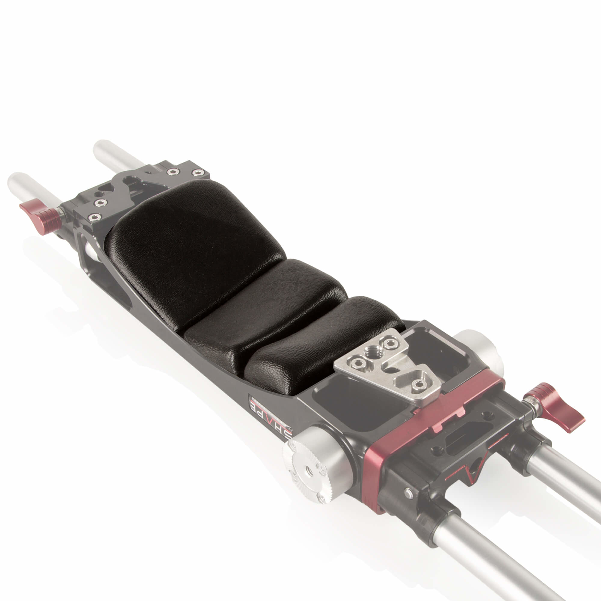 The shoulder pad secures on by touch fasteners. The tripod mount threads are located underneath the shoulder pad. 8″ and 4″ 15 mm rods are included for the front and back. For attaching a matte-box and other accessories, the rod adapter can be adjusted vertically if you remove the screw holding it in position. This baseplate also supports optional SHAPE 15 mm Studio and 19 mm Studio adapters in place of the included one. The baseplate features three camera mount slots, all supporting 1/4″-20 and 3/8″-16 screws. The off-center slots allow you to mount your camera offset if you use a 15 mm Studio Adapter. 1/4″-20 and 3/8″-16 mounting threads are peppered behind the three slots for attaching articulating arms and other accessories. Two 1/4″-20 and two 3/8″-16 camera mount screws are included.