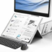 The standivarius Libro H is a portable A3 fold-away document and book holder. It has been designed to provide a correct in-line working position to relieve back / neck pain. It can be used to hold single documents, A4 spreads, open books, A3 sheets of paper or just tablets, what ever you need for your work. With 5 height adjustment possibilities it matches all height and opening angle requirements. It is also an excellent space-saver as it has a smaller footprint and it folds flat to just 2.5 mm- a good ergonomic companion for small desks.