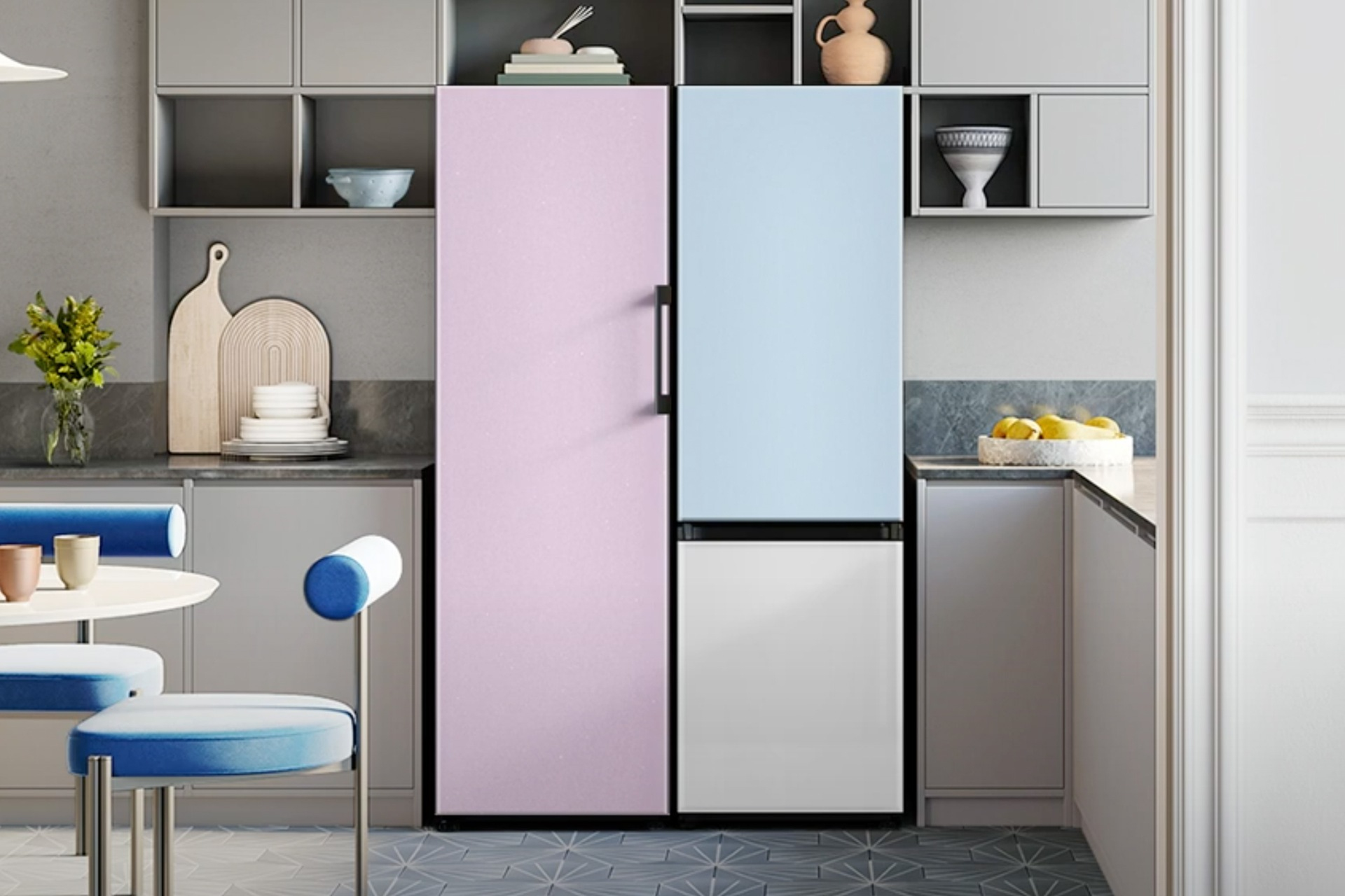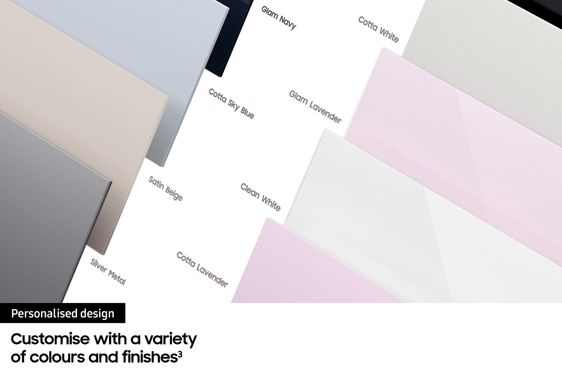 Bespoke-Customisable Design<br>Make your kitchen more you. With custom coloured fridge freezers<sup>[1]</sup> and a varied choice of finishes, it's easy to express yourself and your taste with a Bespoke refrigerator. No longer compromise on style and see your fridge freezer seamlessly blend in with your kitchen. From Clean White to Satin Sky Blue, you can now choose the perfect fridge door colour for you<sup>[1]</sup>.<br><br>Satin – Soft & Silky glass,<br>Glam – Glossy glass,<br>Clean – High-gloss glass,<br>Cotta – Warm & Matt metal finish