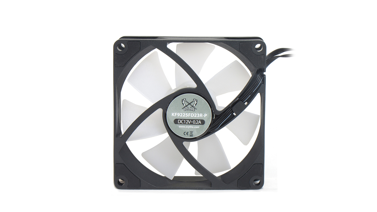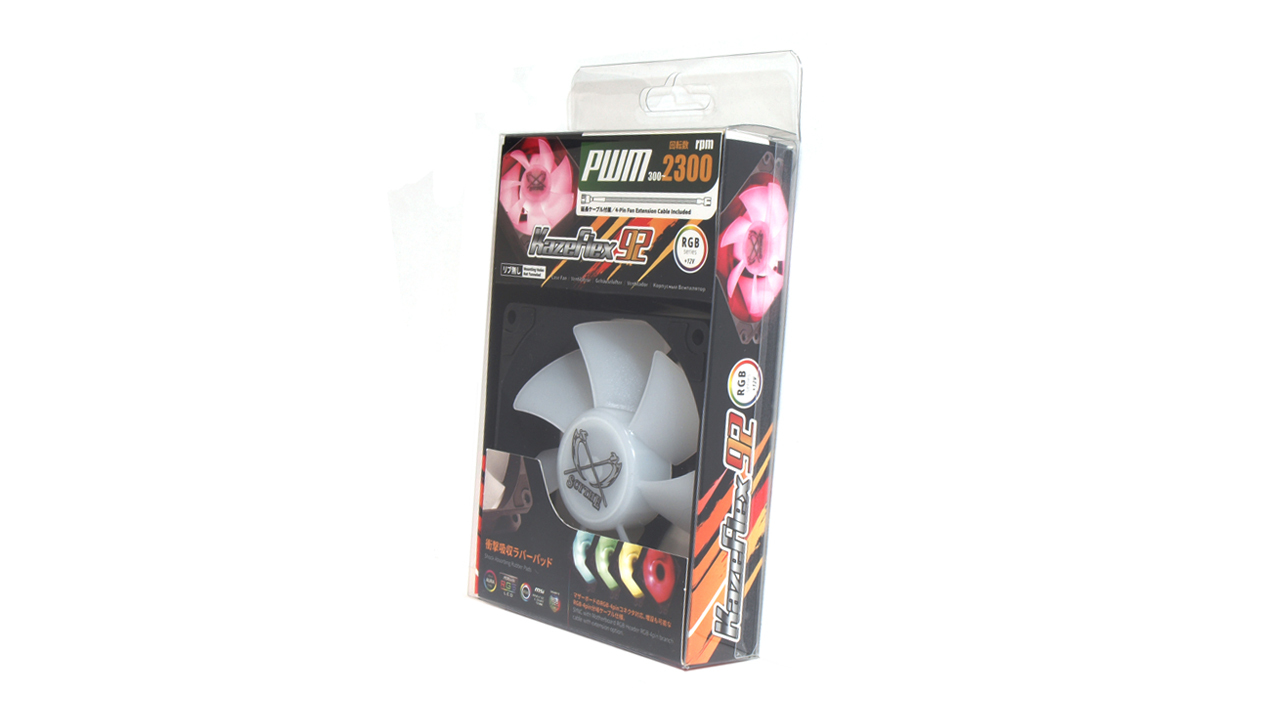 Scythe Kaze Flex 92mm RGB PWM. Type: Fan, Fan diameter: 9.2 cm, Rotational speed (min): 300 RPM, Rotational speed (max): 2300 RPM, Noise level (low speed): 7.3 dB, Noise level (high speed): 28.83 dB, Maximum airflow: 48.88 cfm, Minimum air pressure: 0.08 mmH2O, Maximum air pressure: 2.03 mmH2O. Voltage: 12 V. Width: 92 mm, Depth: 26 mm, Height: 92 mm