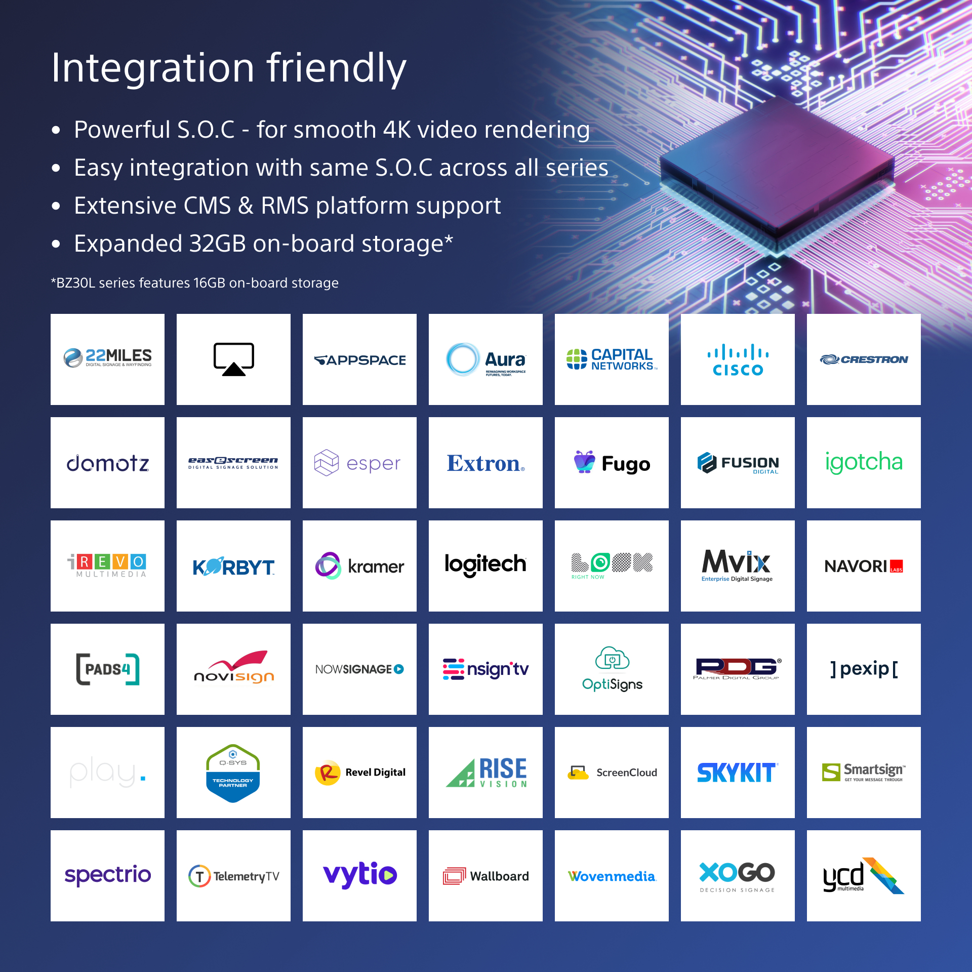 The internal memory on some other displays is eaten up by the operating system, leaving little space for your own apps and content. FW-85BZ40L doubles internal storage from 16GB to a generous 32GB – giving loads more room on board to hold apps, photos, videos and digital signage.