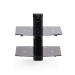The floating wall mount AV shelf features two 5mm thick black tempered glass shelves, providing an unobstructed surface ideal for organizing AV components under or above a TV or display.