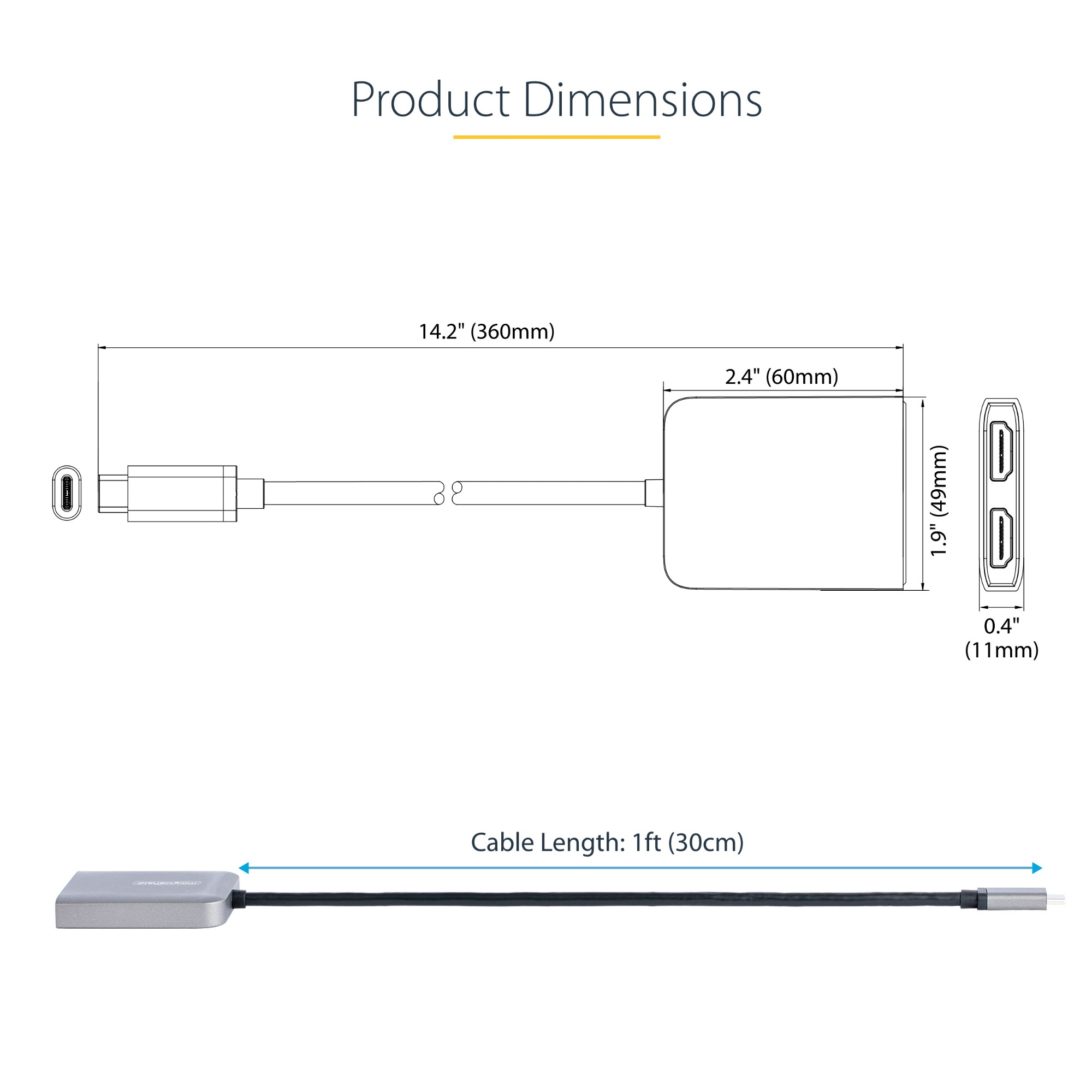 Windows devices that support DP Alt Mode over USB-C feature native support for MST. This USB-C to HDMI hub is compatible with Thunderbolt 4, Thunderbolt 3, and USB4 enabled Windows devices. Plug-and-play installation with no drivers or software required. The 12in (30cm) attached cable provides options for flexible installation configurations, reducing the amount of strain on ports and connectors. Additionally, this dual-monitor splitter is bus-powered, meaning no external power is required.