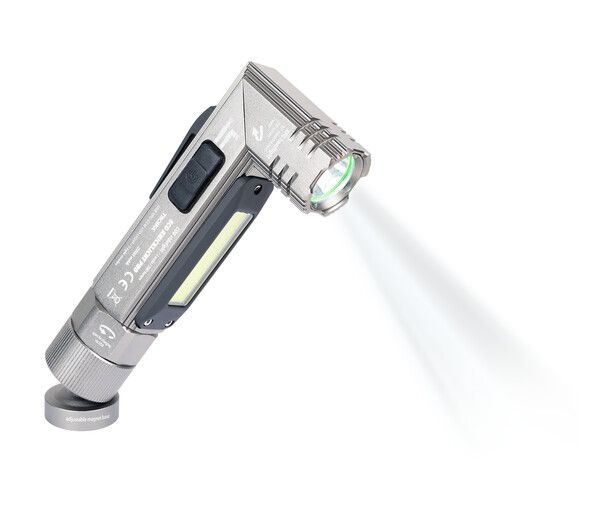 The shining answer to darkness in every form. Under the hood, in the basement corner, in front of your front door, in the event of a power failure – ECO KNICKLICHT PRO simply offers great light. With 200 lumens straight or around the corner thanks to an up to 90° rotatable front LED. With 150 lumens from the side COB LED. On board: numerous lighting functions such as a red flashing warning light for emergencies, charging via USB, a strong magnetic base; belt clip on the back, and, and, and. Made of ABS plastic and aluminium, with an IPX4 splash-proof rating.