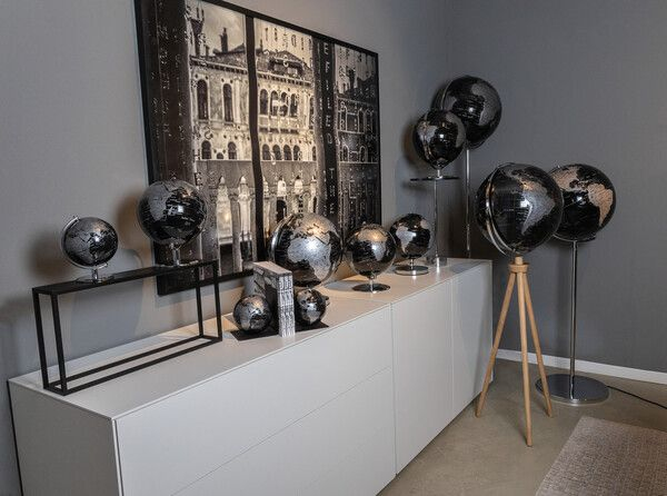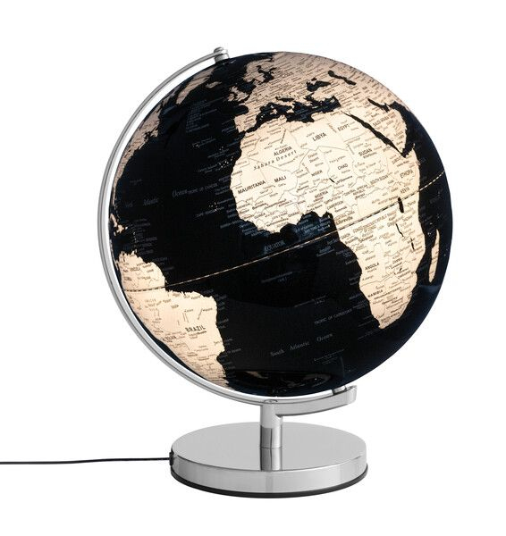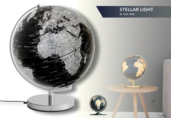 This is how the world lies at your feet: The STELLAR LIGHT globe, measuring 300 x 380 millimeters, reliably ensures wanderlust and displays our planet in atmospheric LED lighting on request. Other elegant details are the high-quality chrome-plated metal frame and the black cable with Euro plug and switch. All continents, oceans, countries and cities are labeled in English.